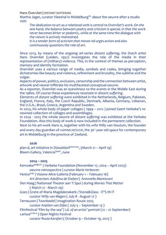 Since 2013, by means of the ongoing art-series distant suffering, the Dutch artist Hans Overvliet (Leiden, 1952) investigates the role of the media in their representation of (military) violence. This, in the context of themes as perception, memory and identity formation. Overvliet uses a various range of media, symbols and codes, bringing together dichotomies like beauty and violence, refinement and brutality, the sublime and the vulgar. Aspects of power, politics, exclusion, censorship and the connection between artist, artwork and viewer infiltrate his multifaceted conceptual oeuvre. The language-image relationship and references to (art) history are always present. As a reporter, Overvliet was an eyewitness to the events in the Middle East during the 1980s. Of course these experiences resonate in DISTANT SUFFERING. The transition into art is inspired by the Dutch Artist Armando: It is the beauty of evil, ‘die Schönheit des Bösen’, located in the belly of the evil, looking for a place in the wake of evil in order to show to show himself to me, although it doesn’t amuse me at all. This beauty calls me to transfer the ‘evil’ into the innocent, because of the amoral domain of art. (Armando, Acknowledgements About Beauty, 1987) The action driven perspective that is included in the approach of Hannah Arendt’s non-paternalistic empathy is the performative part of the series distant suffering. Elements of distant suffering were exhibited in the Netherlands, Belgium, Pakistan, England, Italy, the Czech Republic, Denmark, Lebanon and Sweden. Hans Overvliet was born in Leiden in 1952; he lives and works in the province of Zeeland in the South-West of the Netherlands. Next to his art-work he is, together with his wife Willy van Houtum, the founder and every day guardian of the 27-year old space for contemporary art: ruimteCAESUUR. | Hans Overvliet