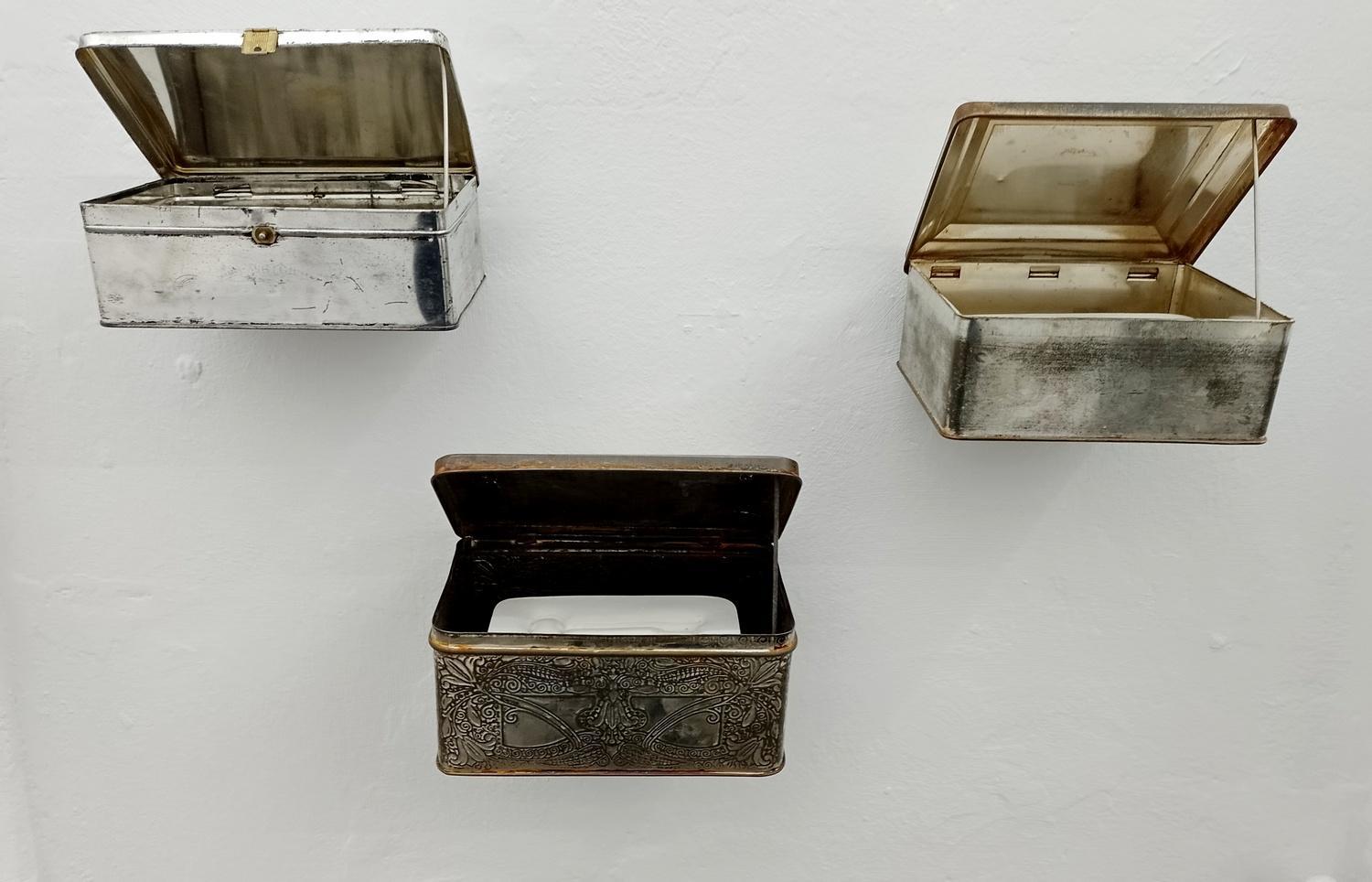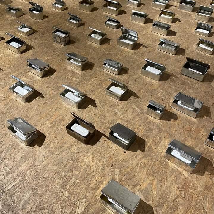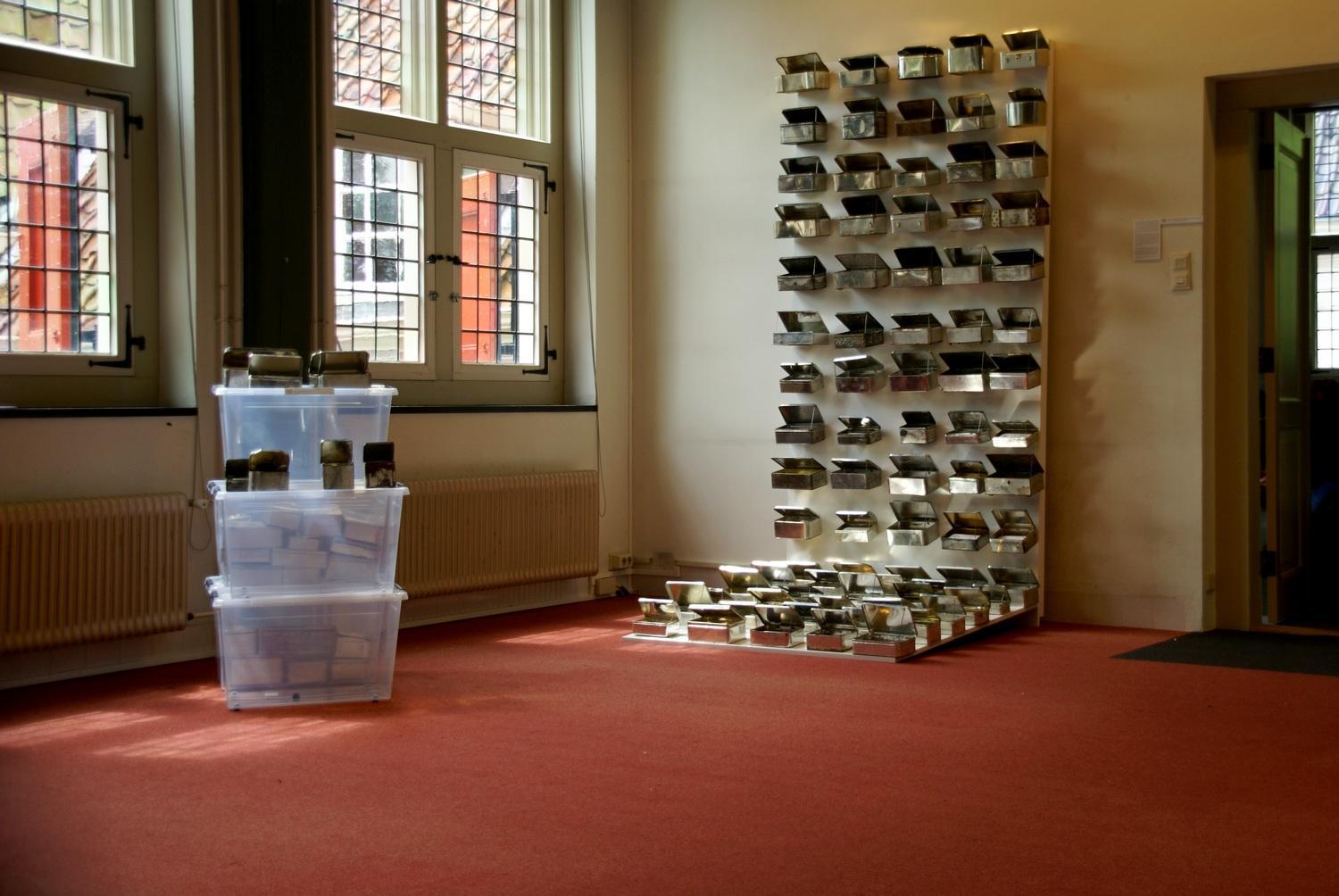 The artwork consists of 215 scoured biscuit tins, of which I remo-ved the enamel and / or paint. Inside the tins are a print of a key, pressed into plaster in the shape of a gold bar.