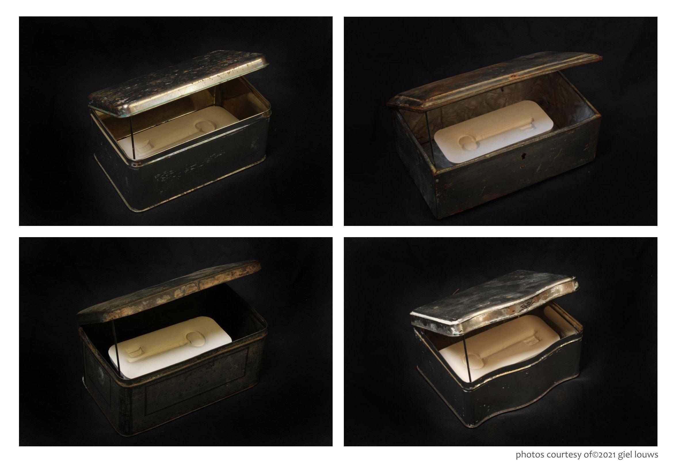 selection from in total 215 old, cleaned tin cans an imprint of a key, pressed into plaster in the shape of a gold bar