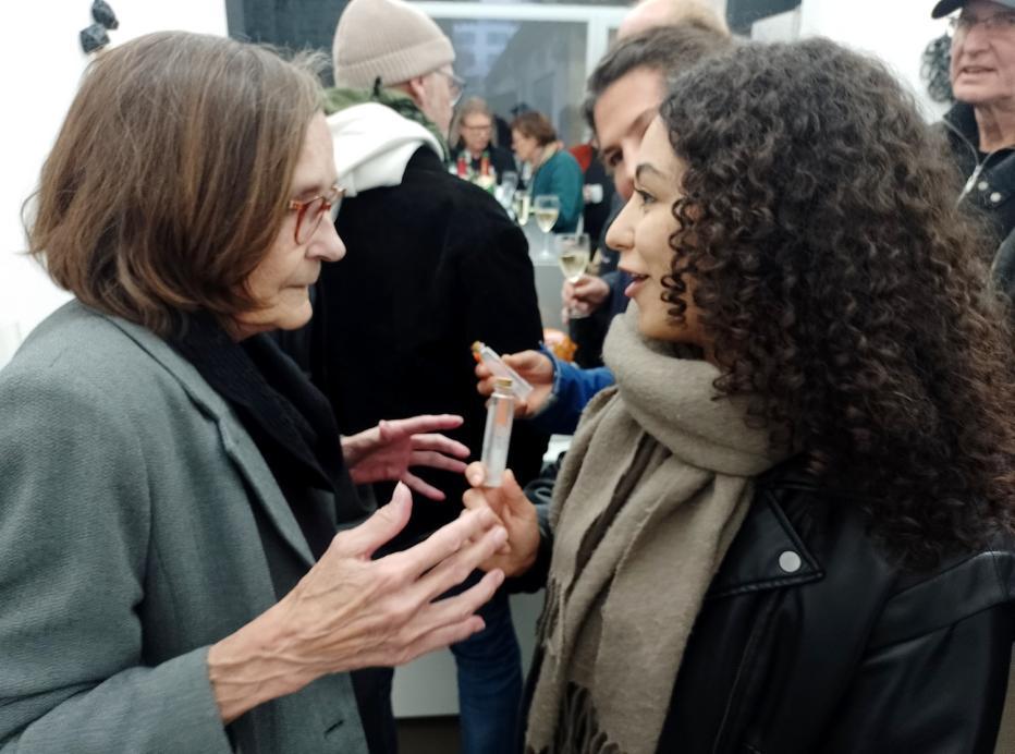 She is standing there, her hands around the head of the other head scarfed girl. Eye in eye. Face à face . . .