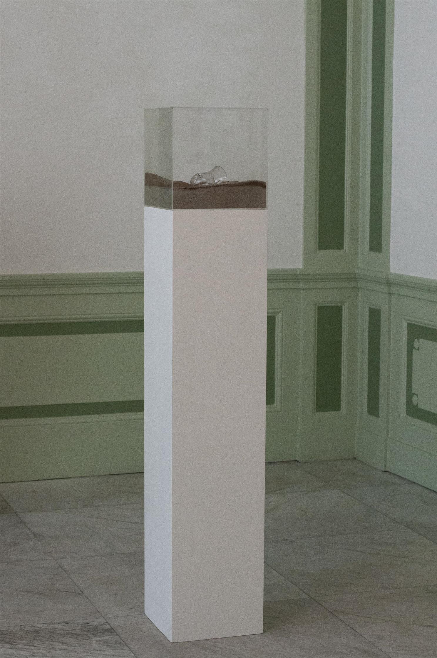 sand from Česká Skalice [ Czech Republic ] plexiglass hood | 25 x 25 x 25 [ x o,3 ] cm. console | 110 x 25 x 25 cm. MDF 9 mm., primer white / topcoat Gamma white 710 – matt