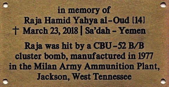 Raja was hit by a CBU-52 B/B cluster bomb, manufactured in 1977 in the Milan Army Ammunition Plant, Jackson, West Tennessee, U.S.A.