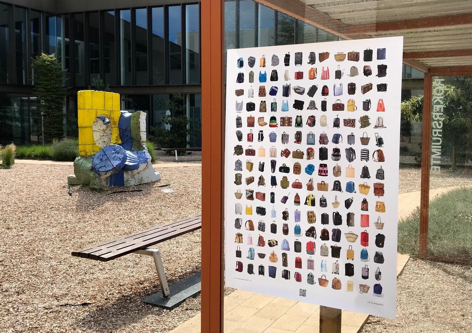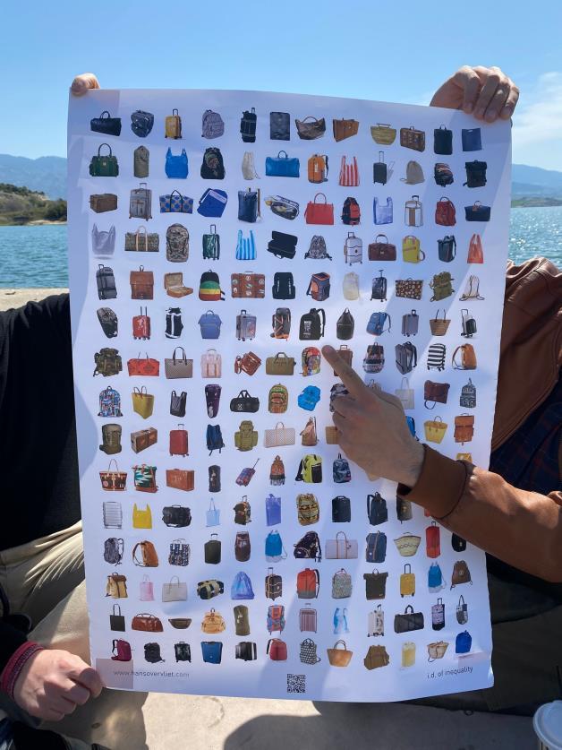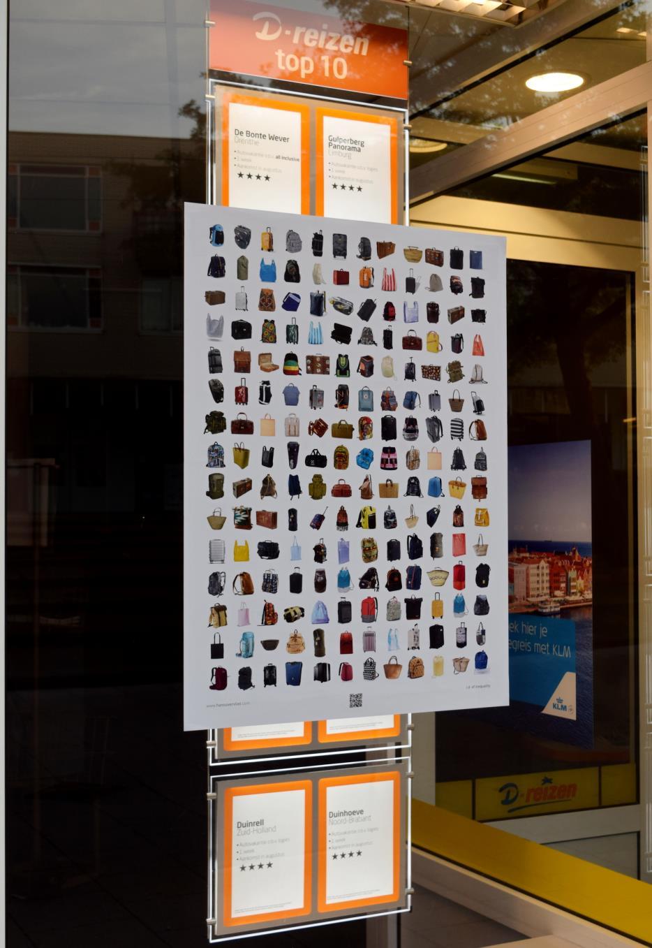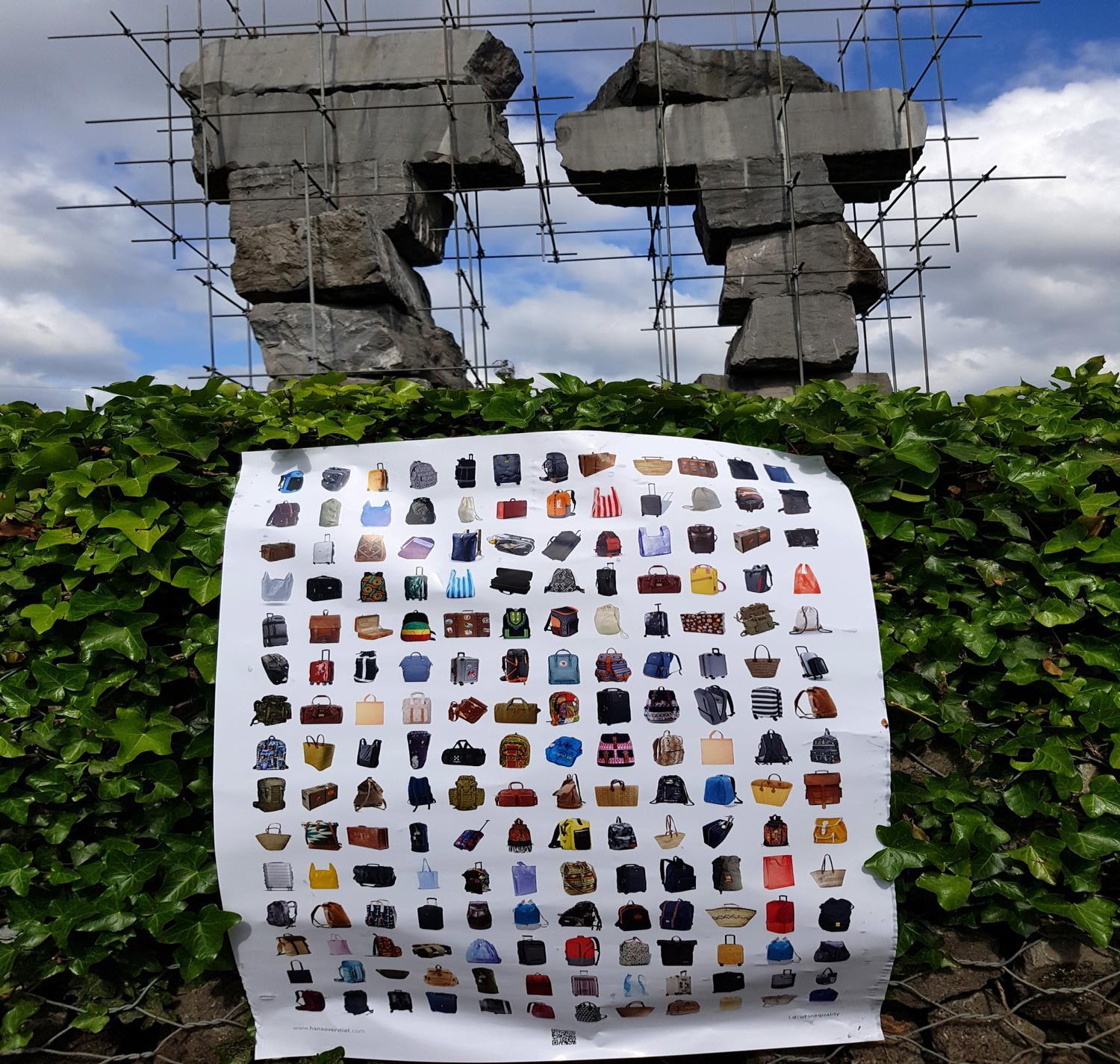 Diese Mobilität steht in starkem Kontrast zu der notwendigen Flucht vor Krieg und Armut von Migranten. Den herzlichen Empfang, den die westlichen Menschen überall erwarten können, gibt es für sie nicht. Keine Infrastruktur, in der sie sich sicher fühlen, keine Steuervorteile, sondern unzählige Gefahren, Nöte und hoffnungslose Zugangskriterien. Ihre Mobilität ist so weit wie möglich eingeschränkt und wird uns im Sinne eines „Empfangs in der Region“ verkauft. Derweil drückt sich die Realität in erniedrigenden Flüchtlingslagern aus. Kurz gesagt, Mobilität ist derzeit eines der deutlichsten Beispiele für Privilegien. Das Poster zeigt jedoch eine der wenigen Ähnlichkeiten zwischen diesen verschiedenen Reisenden, nämlich ihr Gepäck. Der entscheiden-de Unterschied besteht im Inhalt dieser Koffer, Taschen und Ruck-säcke.