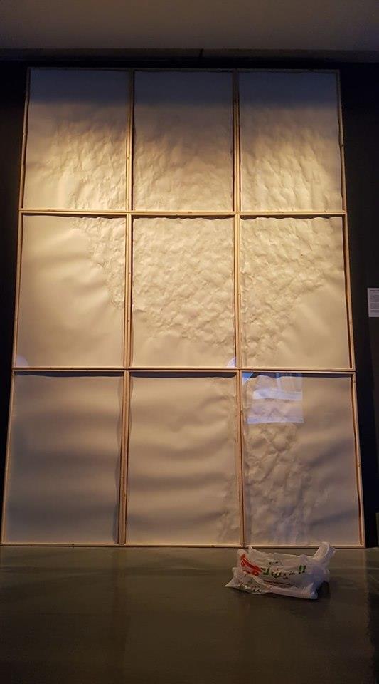 Cloud, painted with the actually rubble from the spot in Gaza where annihilated Mishal Cultural Center was situated, in extremely diluted