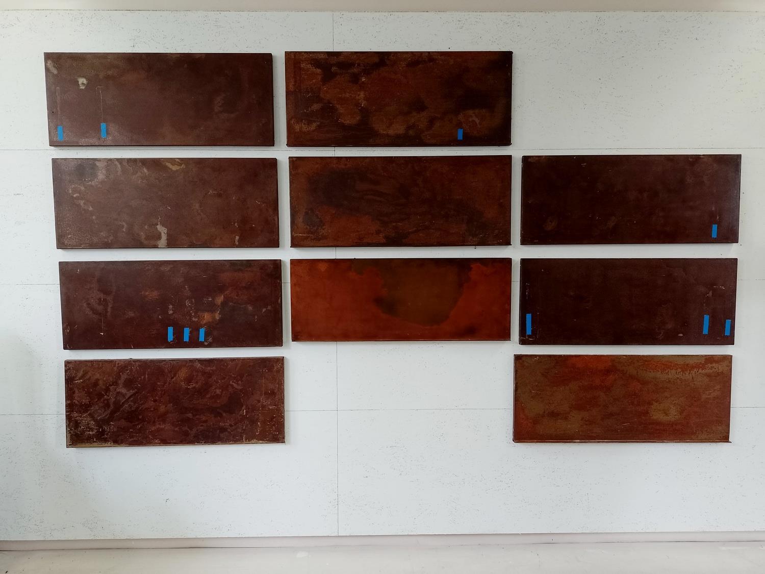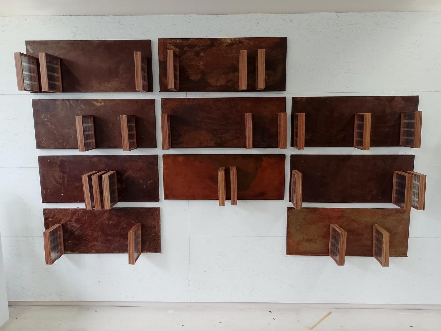 weathering steel 2x [ 10 x 10 mm.] 1x [ 12 x 12 mm.], wooden bars 1 x 1 cm.,