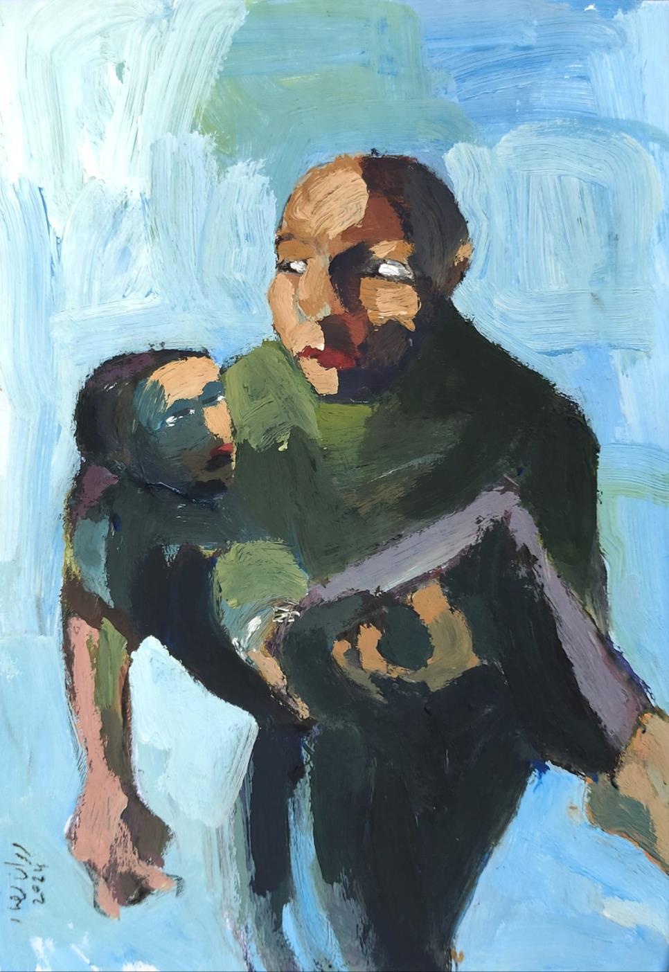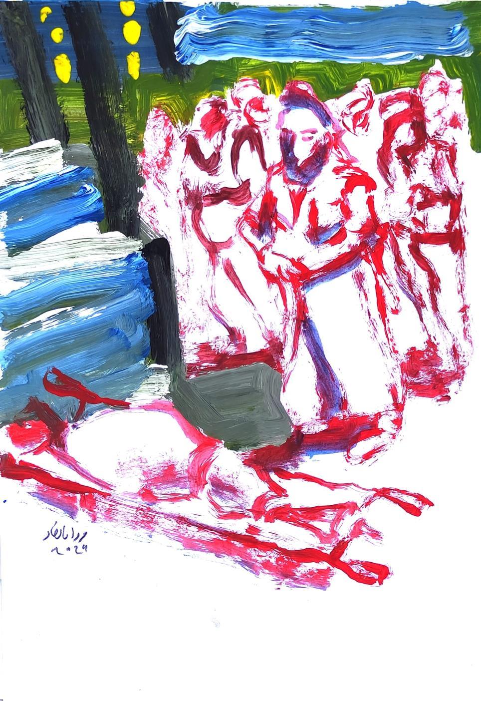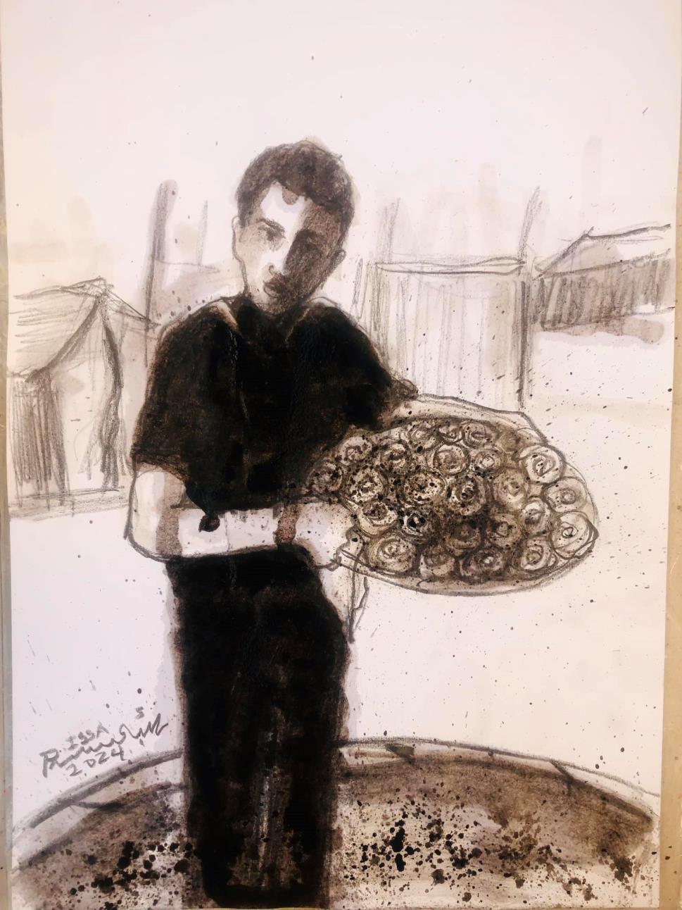 Staat van Exodus Tijdens de laatste verplaatsing ben ik onlangs zonder technische hulpmiddelen verplaatst, maar binnen met wat er beschikbaar is, zijn verschillende werken geproduceerd op papier van patiënten met maagproblemen; heel Gaza lijdt aan maagproblemen. .