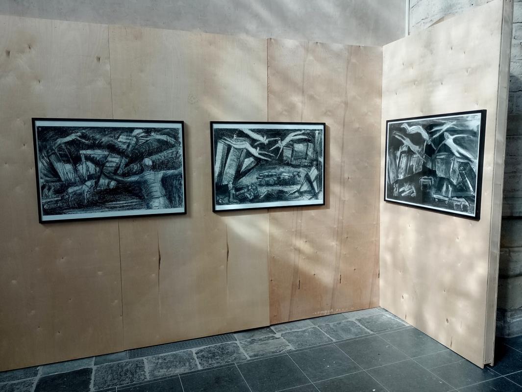 In houtskool ontstaan in een langdurig tekenproces de nachtelijke scenes waarin de dolende doden nog aanwezig zijn en het verwoeste leven ter plekke gadeslaan.