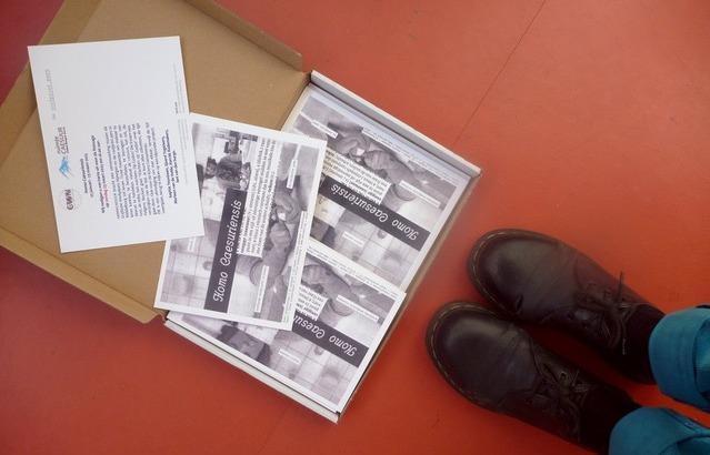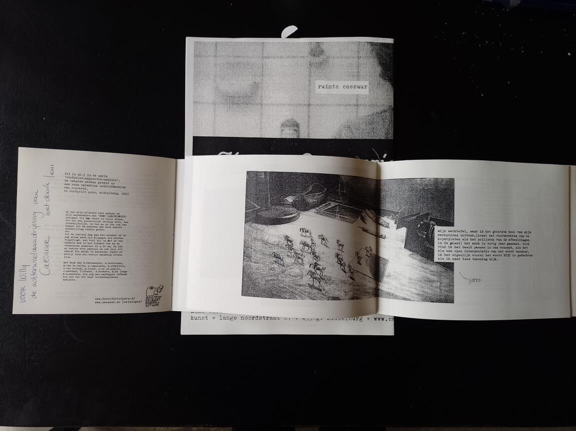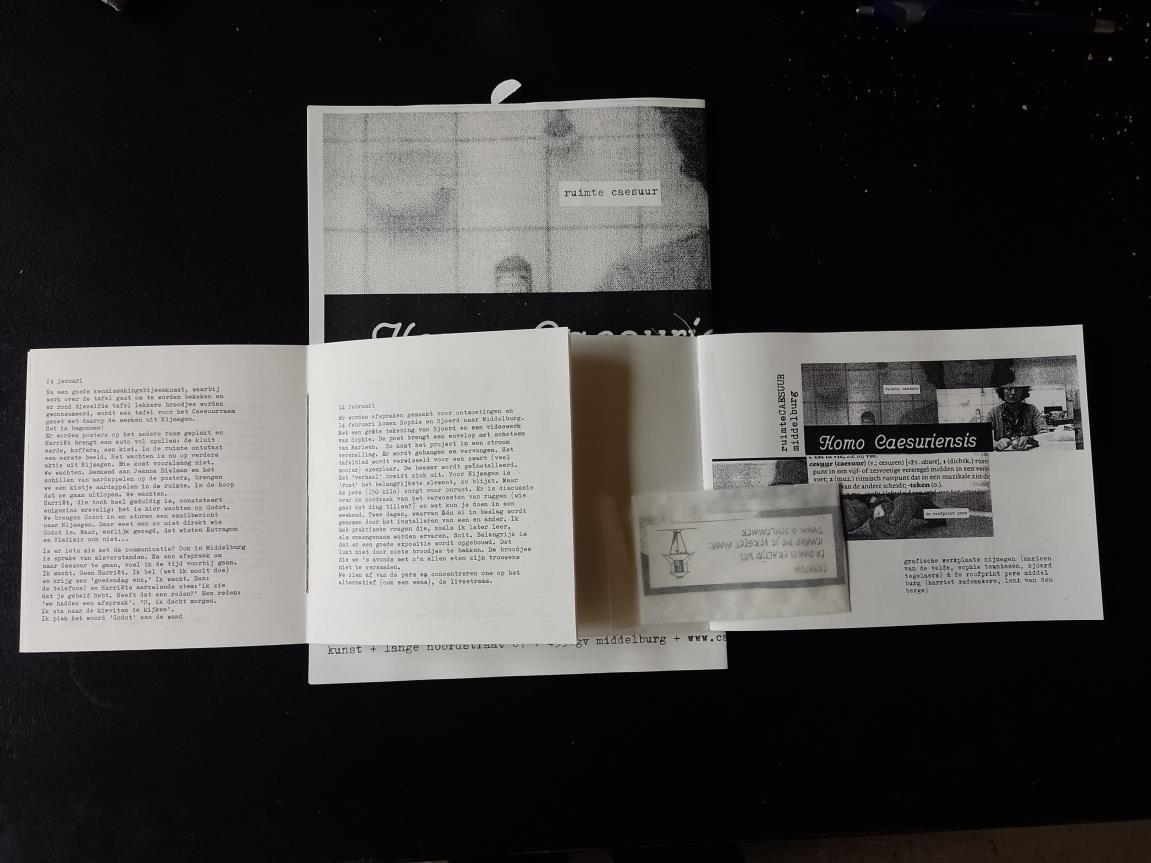 HOMO CAESURIENSIS (de caesuriaanse mens) is een samenwerkingsproject van de grafische werkplaats nijmegen en de roofprint pers in middelburg. plaats van handeling: de ruimte van CAESUUr, lange noordstraat, middelburg. de spelers: Sophie Teunissen, Sjoerd Tegelaers, Marleen van de Velde, (grafische werkplaats nijmegen) met harriët rademakers & leni van den berge (de roofprint pers). (voorlopige) uitgangspunten middelburg: een steen, een spruitende aardappel, een trapleer met een geschiedenis, wellicht een drukpersje, boeken en een triadisch ballet. de titel verwijst naar het idee dat iedereen die meewerkt dat doet in de geest van CAESUUR: vrij en eigenzinnig. het doel van deze catalogus is dat het functioneert als een soort vandaag boek dat mensen kunnen volgen. de verstolling maakte leni in de vorm van een van haar boeken . . .