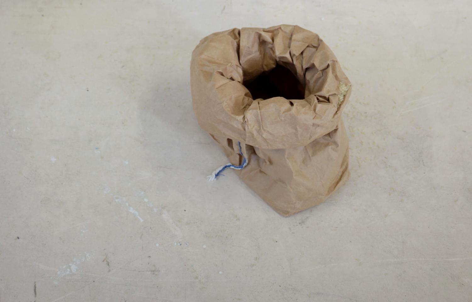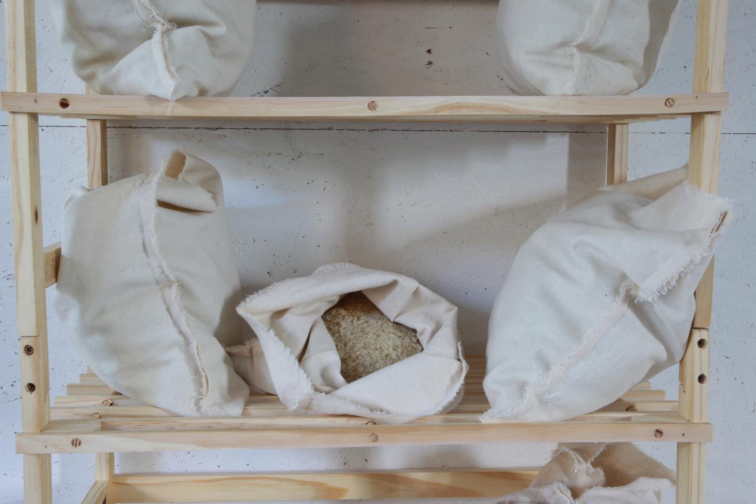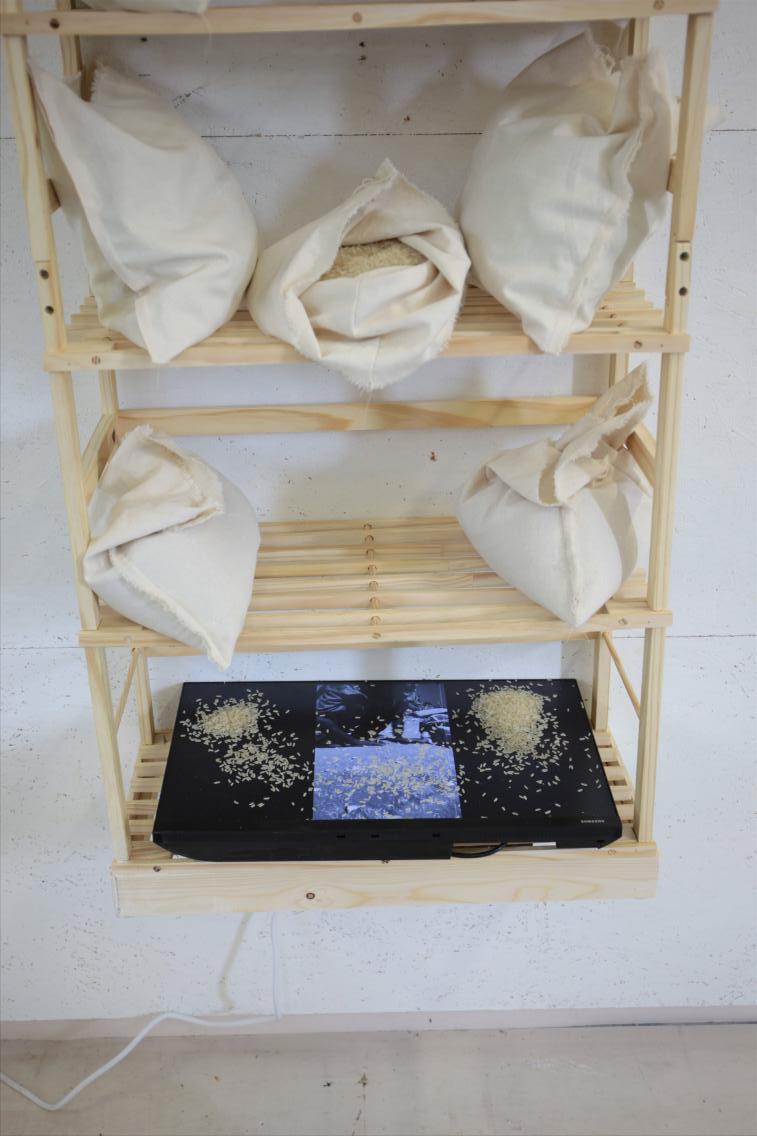 Work DISTANT SUFFERING LVI | i.d. of shared betrayal cotton pouches with bullet holes caused by air pistol Webly Tempest 4,5 mm, nr. 221796, Webly&Scott LTD, Shagai Parboil rice, mixed with Riz noir interdit, Maison Sabarot, video, courtesy by ©Myuz Ahmed, July 27, 2025, Gaza Strip, edited to black and white with scratch filter, 24” TV- Samsung LF22T450FQUX | Speedlink BRIO - Stereo Soundbar, brown paper bag from bakehouse ’t Zand, Middelburg, Monzana Storage Rack Bookcase, 5 Shelves, 135,5 x 58 x 27 cm, July 27 – August 29, 2025.