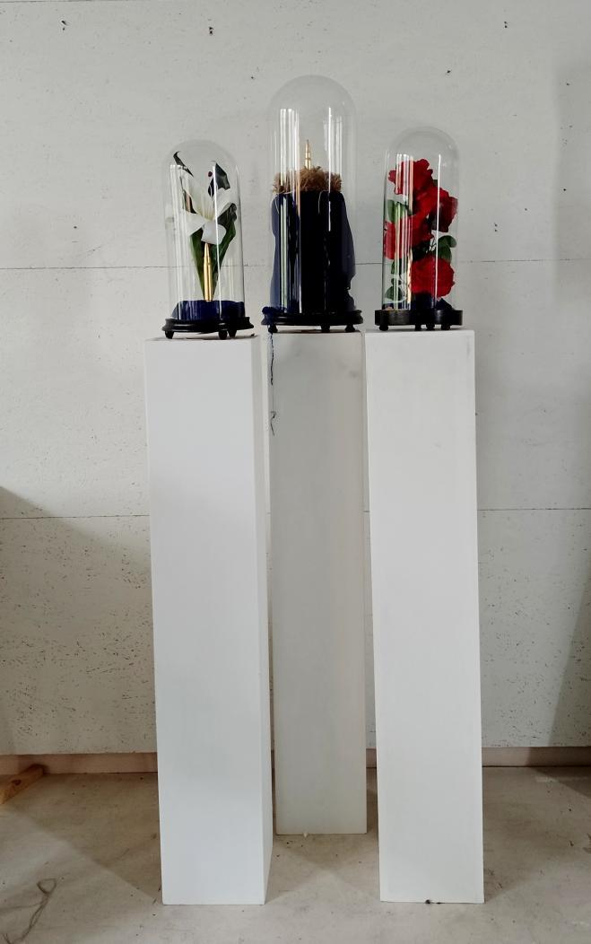 gold plated ceramic bullet, silk roses, blue velvet, classic bell jar 50 cm Ø | 22 cm