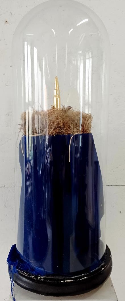 gold plated ceramic bullet, nest of a blue tit from our garden, unhatched egg, eggshell, blue velvet, classic bell jar 70 cm Ø | 30 cm