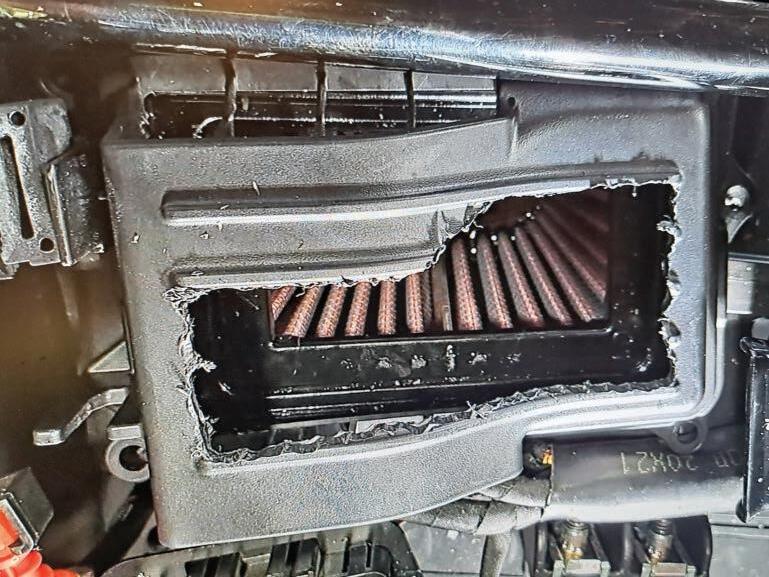 Are there indications of mouse droppings, spiderwebs or paw prints? Once varmints get out of the weather they look for a home and, unfortunately, motorcycles offer lots of opportunity for winter residence. Airboxes are a favorite of mice as they chew up the air filter to make a nest. Mouse urine is terrible, causing acidic corrosion. Insects like small areas to build mud nests and webs, with the air pipes that run up the sides of a Yamaha Virago frame are notoriously inviting to spiders and wasp/hornet nests.