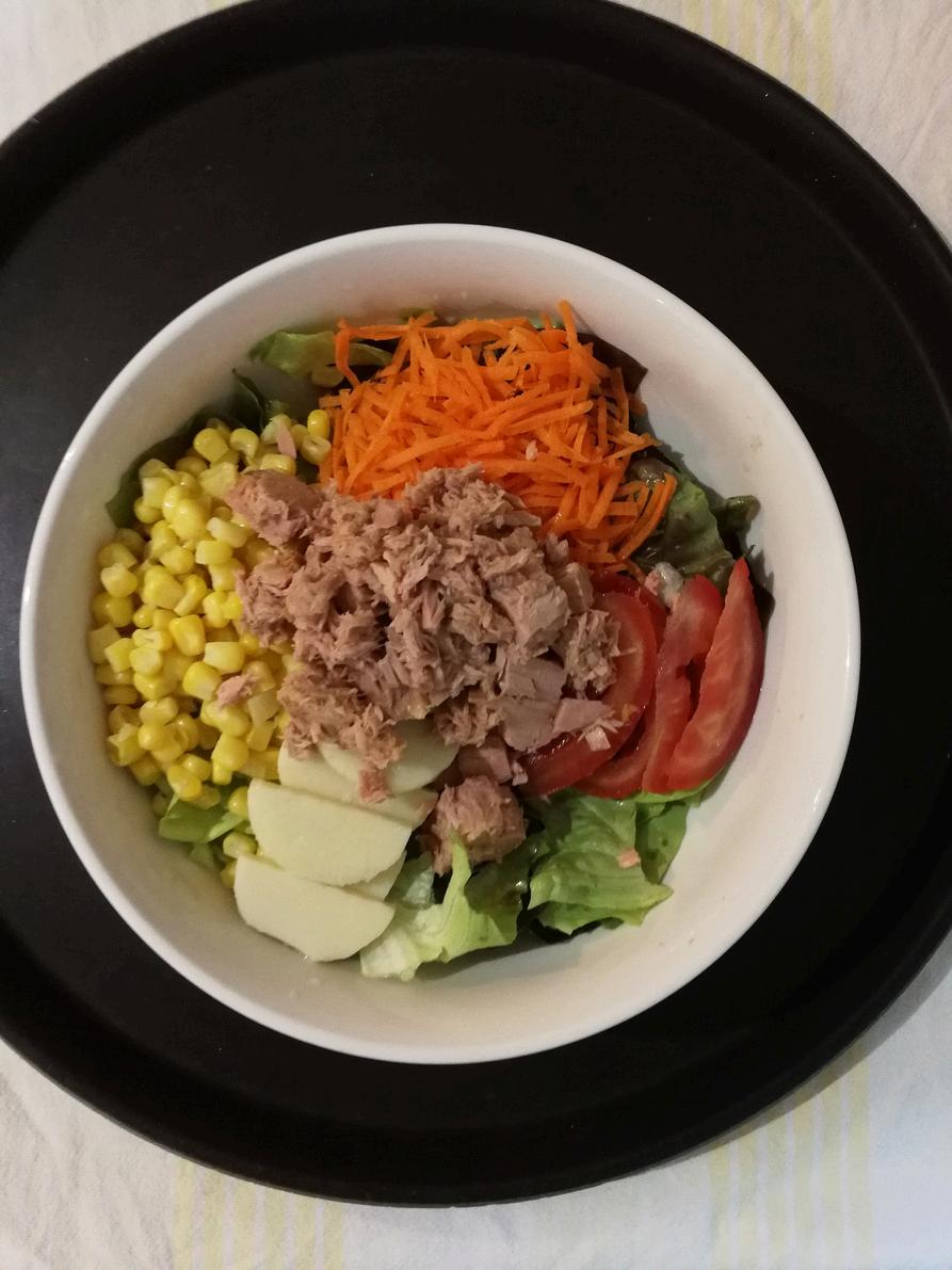 Lechuga, zanahoria, choclo, palmitos, tomate y lomitos de atún.