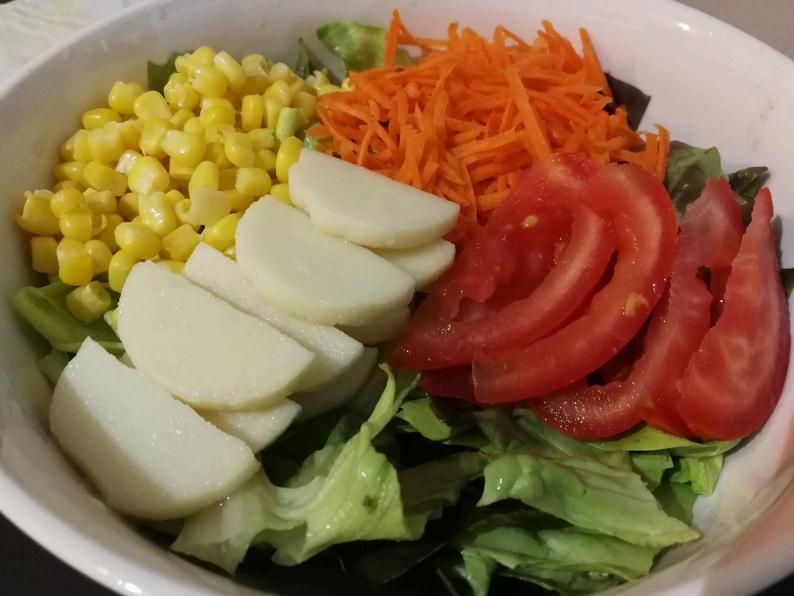 Lechuga, zanahoria, choclo, palmitos, tomate y 2 huevos duros
