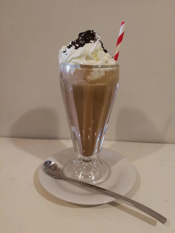 Shot de café, helado de vainilla, leche y crema chantilly.