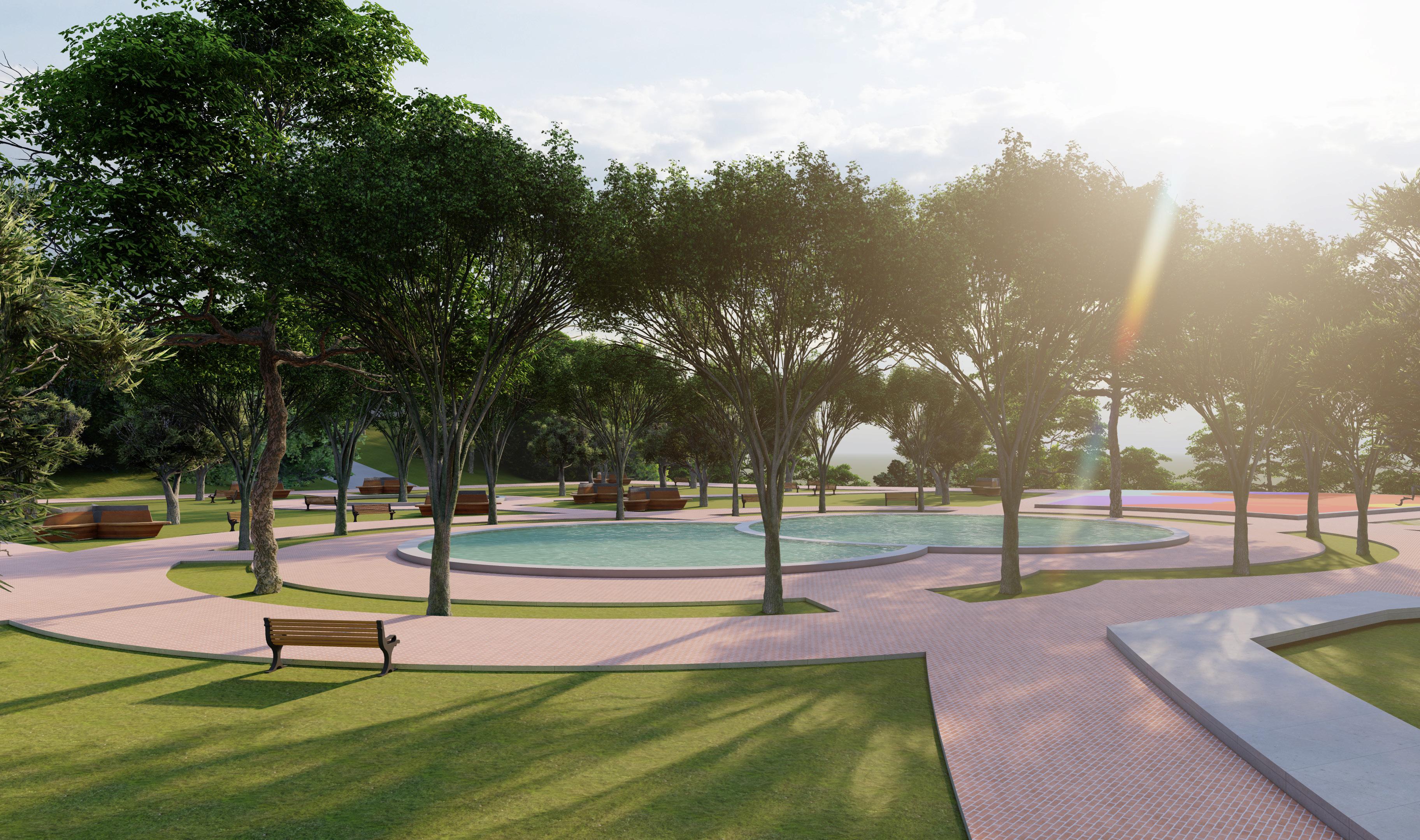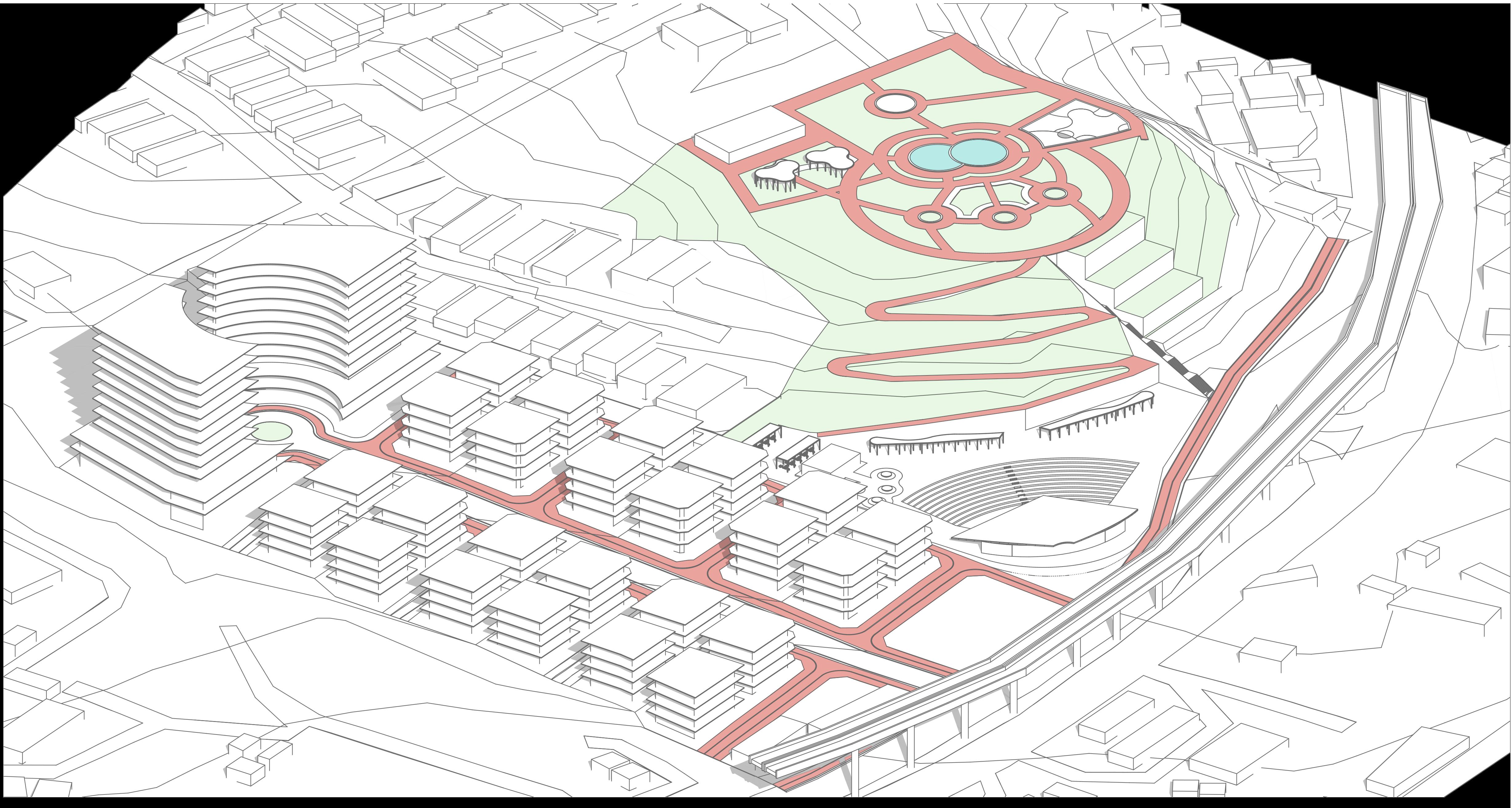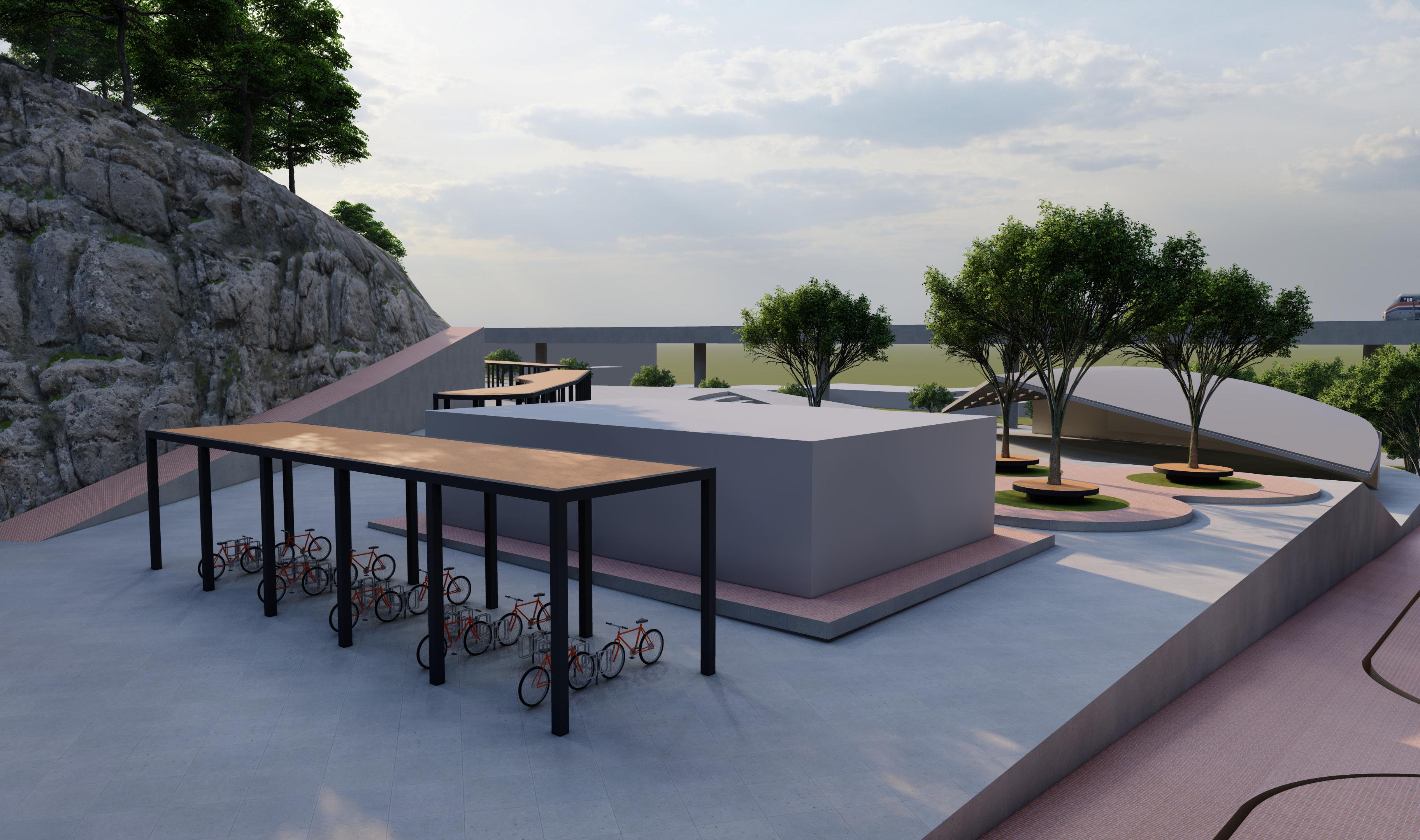 Tercera intersecciòn: realizamos un parque urbano, siendo el punto más alto de nuestro proyecto y aprovechando esto colocamos un mirador que tiene vistas tanto a la plaza como a las àreas residenciales, locales, estaciòn de metro y el resto de su entorno