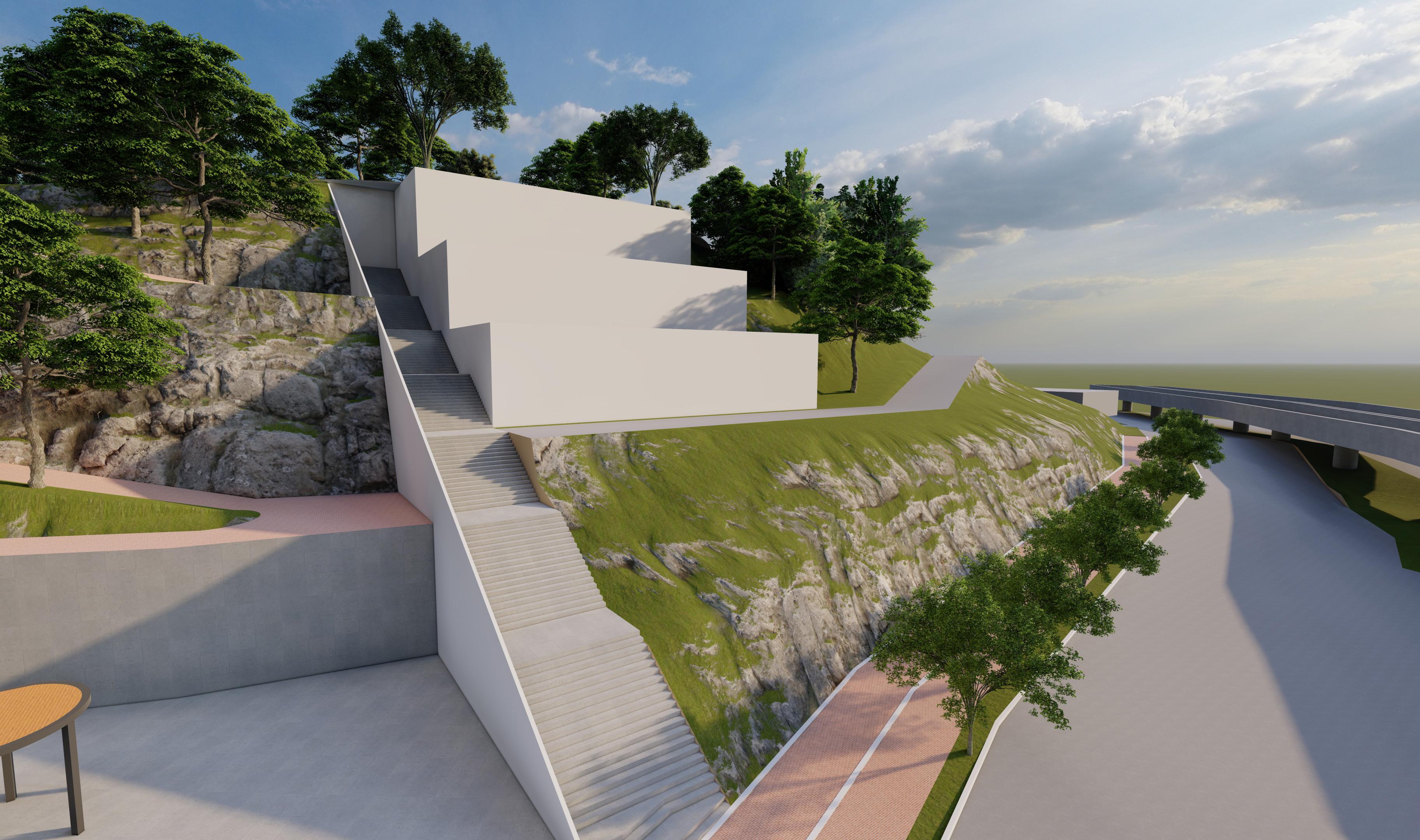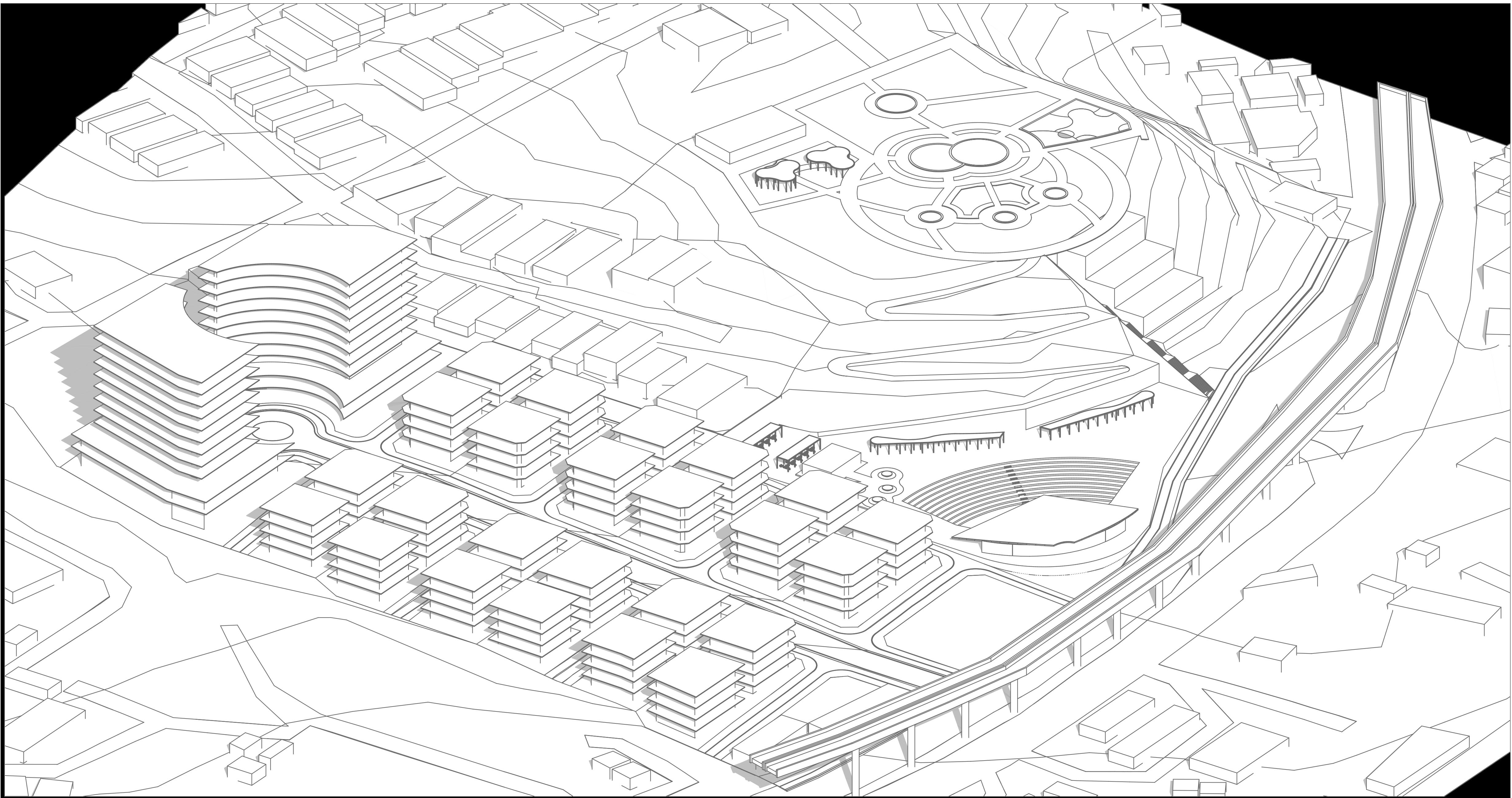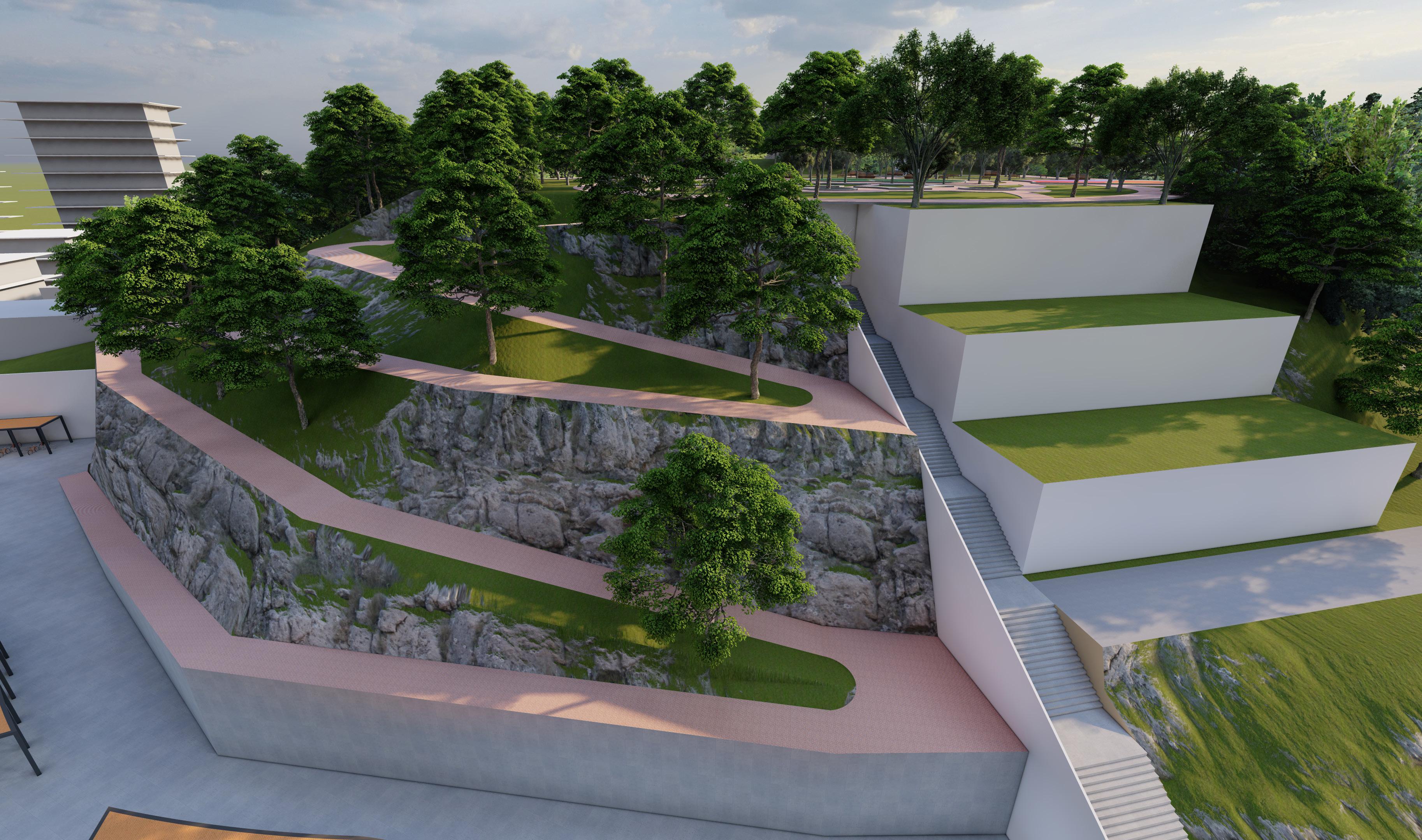 Tercera intersecciòn: realizamos un parque urbano, siendo el punto más alto de nuestro proyecto y aprovechando esto colocamos un mirador que tiene vistas tanto a la plaza como a las àreas residenciales, locales, estaciòn de metro y el resto de su entorno