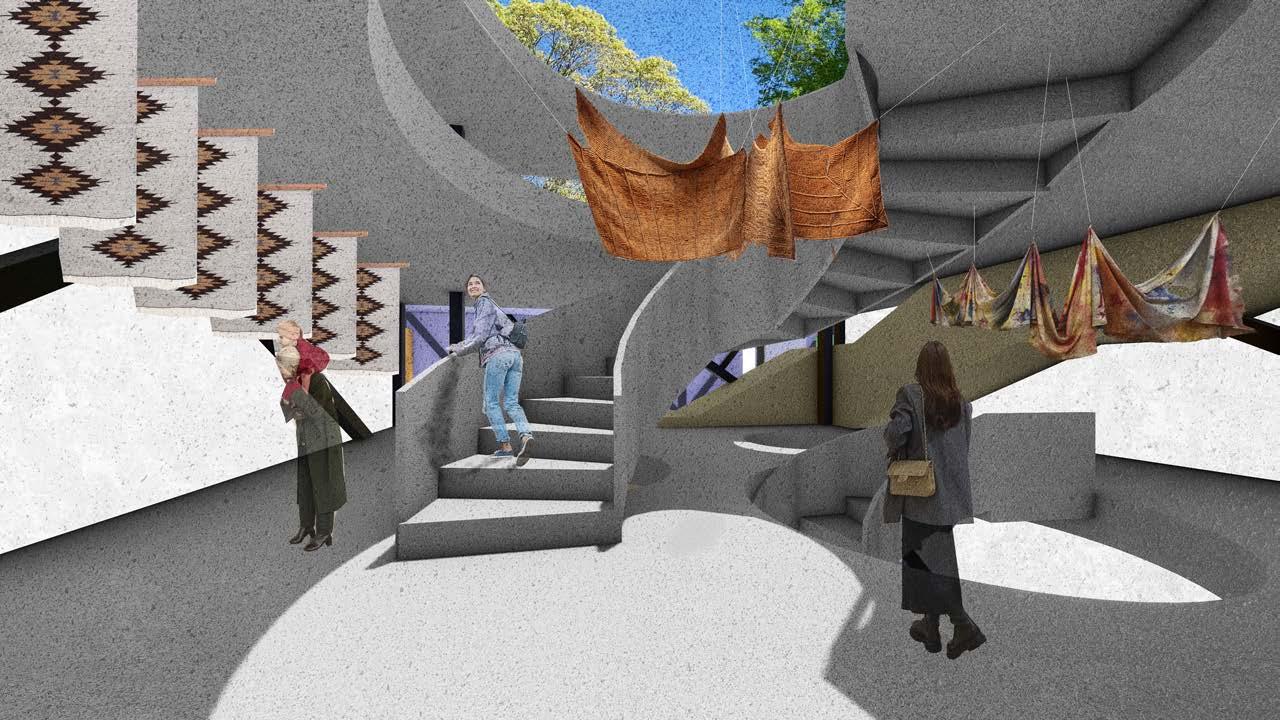 Each of the artist’s blocks has an occupiable roof that is accessible from the gallery and therefore by the public. On the studio side, there are circular walkable skylights so that visitors can observe the artists in their practice.