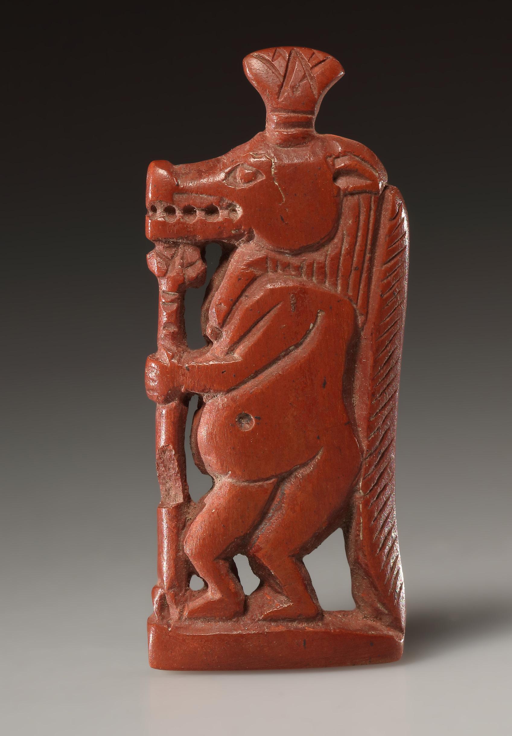 the piece to be worn as an amulet or pendant on a chain. In the domestic sphere, Taweret was regarded above all as the protectress of pregnant women and was believed to ward off all evils that might befall mother and child during labour. Because of her terrifying appearance, which is further emphasized by the open mouth, the goddess was also thought to possess magical protective powers. Small chip on the scepter.