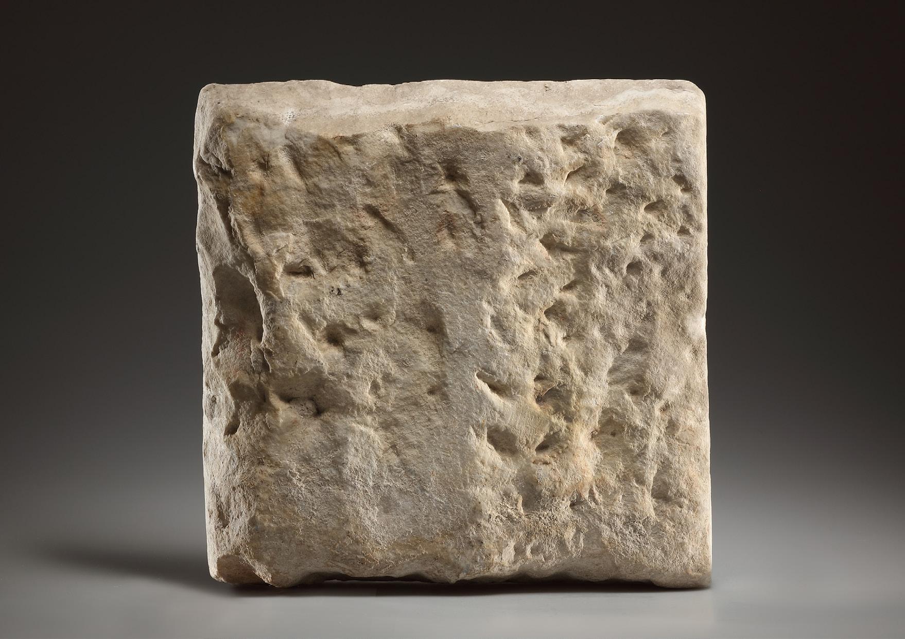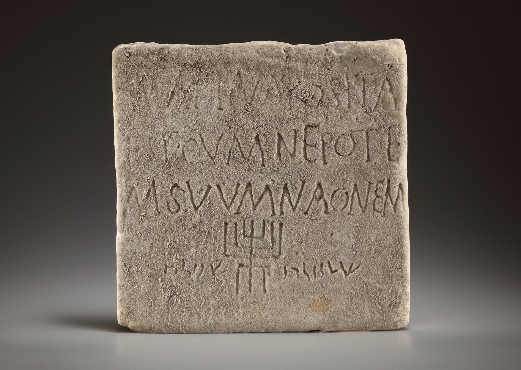 Square marble slab with a four-line inscription on the front: [...]INA POSITA / EST CVM NEPOTE / M SVVM NAONEM (Here lies ...ina with her grandson Naum?). The fourth line consists of a menorah flanked by Hebrew letters. Roughly hewn on the reverse with visible tools marks and some remains of cement, suggesting that the slab was once attached to a wall or something similar. A few sinter deposits on the surface. This important artifact bears witness to Jewish culture in the Roman Imperial Period.