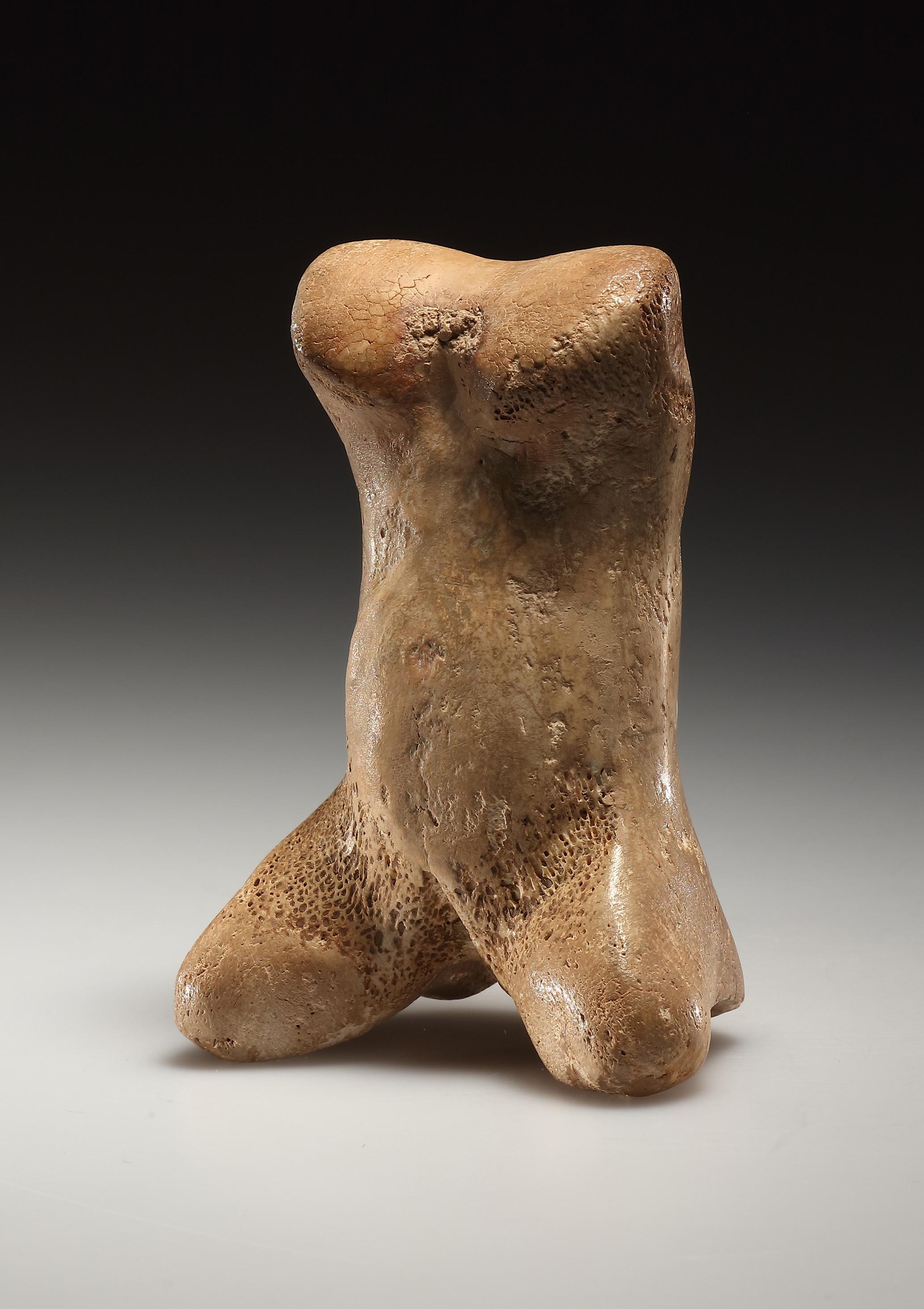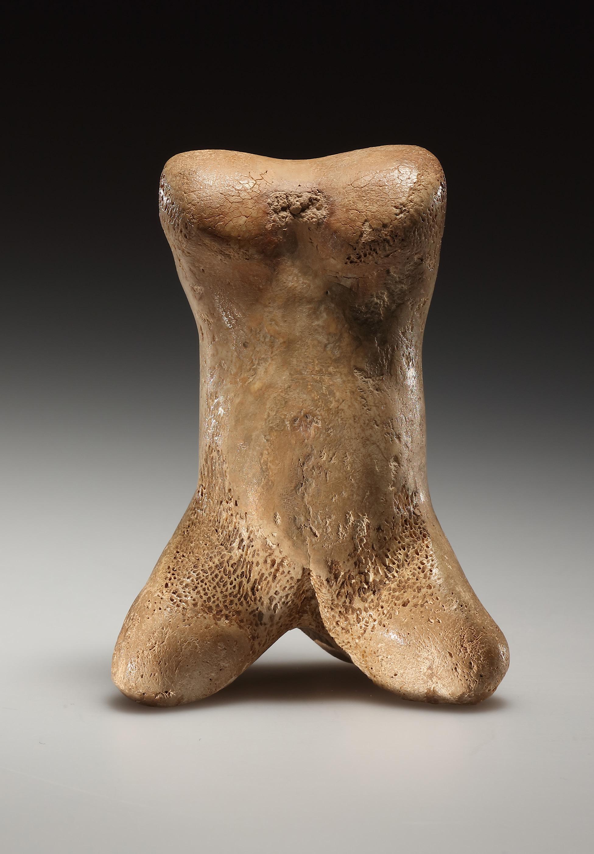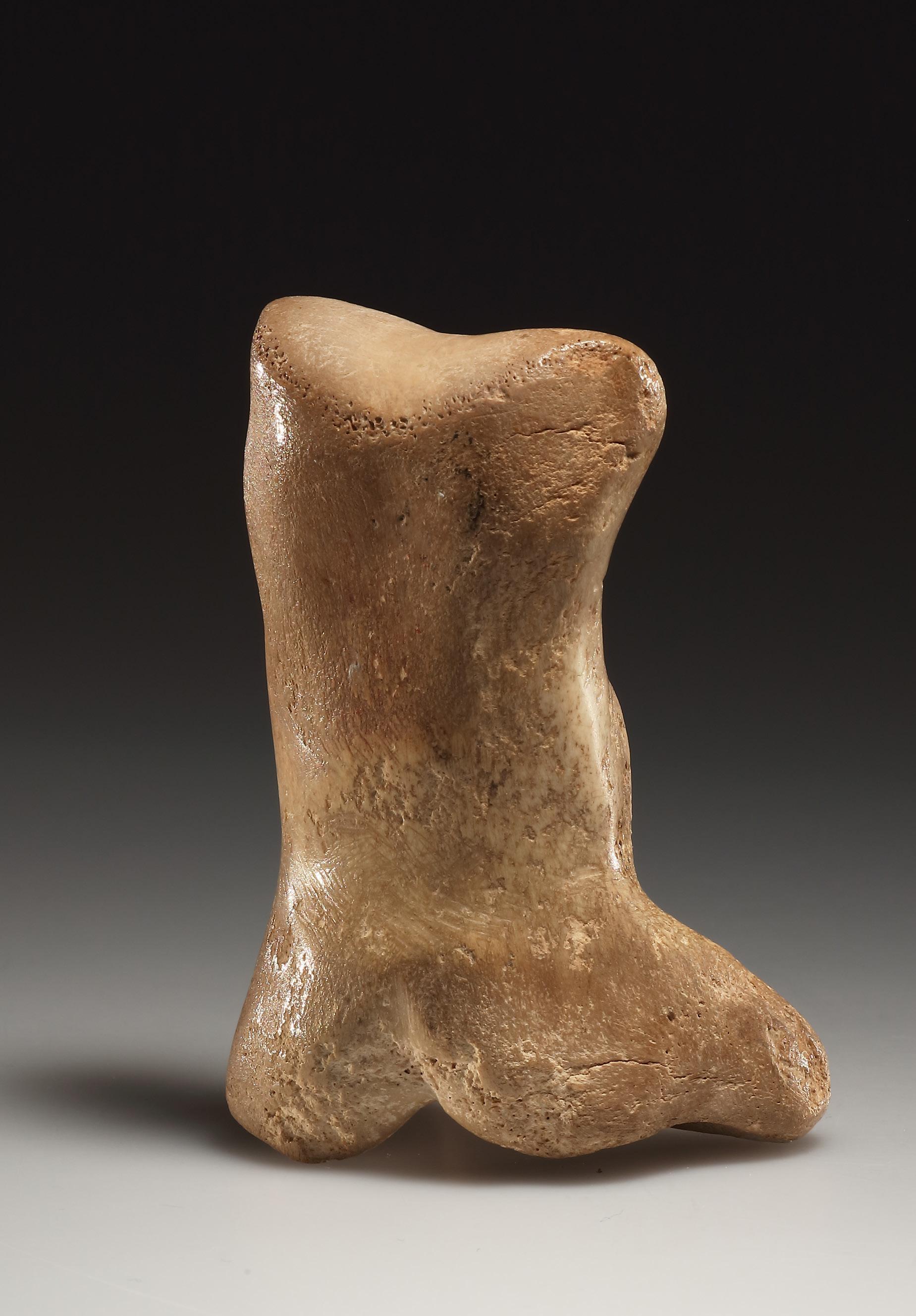 three incised lines at the top edge perhaps indicating the loose skin of a recently post-partum woman. This physiognomic detail occurs in a small group of other known examples, although its significance in the third millennium B.C. is not well understood. Beneath the swell of the belly, a round drilled navel and slightly depressed pubic triangle. The legs are straight and carved separately along their entire length with slightly protruding knees. Block-shaped feet with flat bottoms and three toes indicated on each. The spine is rendered by a shallow groove from nape of the neck to cleft of buttocks. Slightly arched lower back with two „Venus dimples“ over the buttocks, rendered by slightly asymmetrical round drill holes. White, medium-