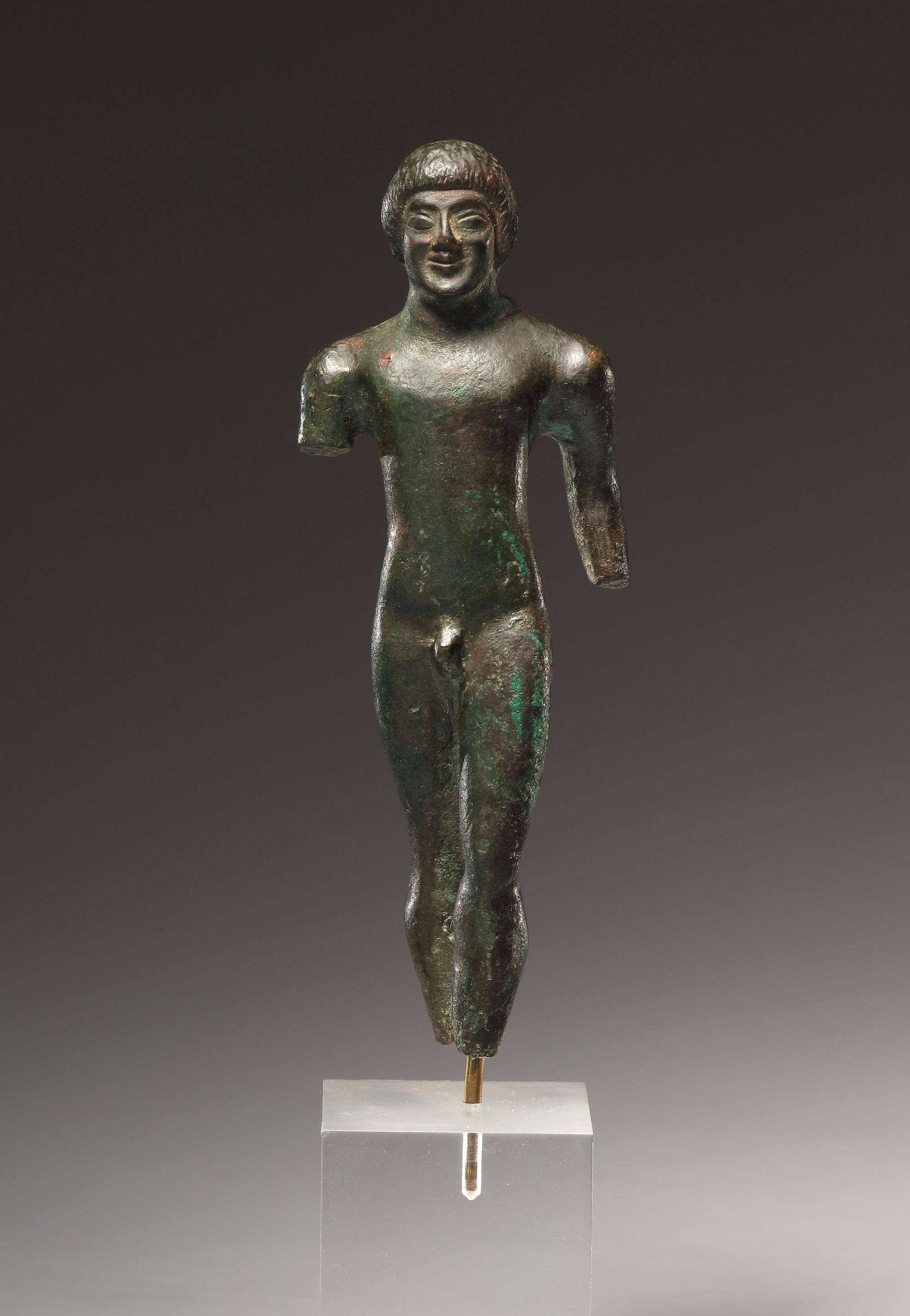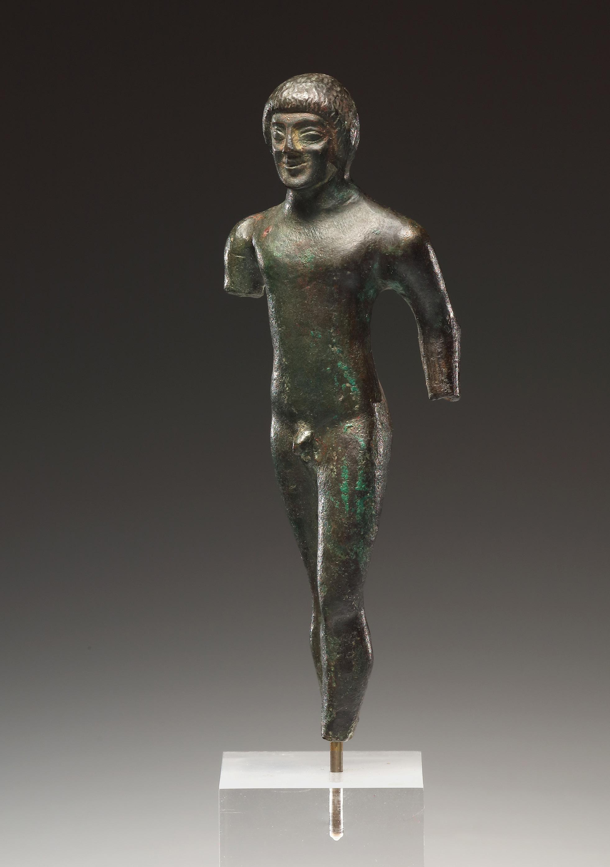 High-quality bronze statuette of a naked youth shown in a strictly frontal pose. He stands in the characteristic archaic striding position with the left leg slightly advanced. This posture is based on Egyptian prototypes. The body is slender and its anatomy is rendered in a schematic manner, with softly modeled transitions between the shoulders, chest, and legs. The upper arms hang down, yet the rigidity of the stance is subtly softened by the left arm, which is drawn back, bent, and held slightly away from the body. The youth wears a short, cap-like coiffure that completely covers the ears and is enlivened with fine incised striations. Almond-shaped eyes, pronounced cheekbones, and the enigmatic “Archaic Smile” convey an impression of vitality and form a striking contrast