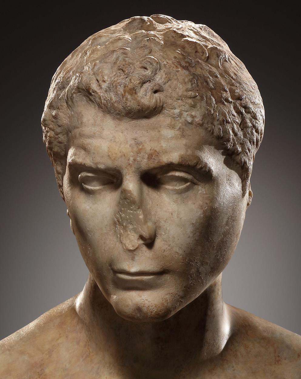 limited to the area above the centre of the forehead, where the hair is slightly raised and end at the hair whorl on the top of the head. The rendering of the hair above the forehead and the fleshy brows with curved furrows are characteristic of depictions of satyrs. Furthermore, the right ear tapers towards the top and may well have originally ended in a point. The shape of the face with the slender lower section and the small, slightly receding chin with its distinctive dimple are the result of the reworking of the head. These physiognomic features are also found in portraits of Emperor Nerva (96-98 A.D.). Mounted on a bust of the 19th century; the break runs through the upper part of the neck. The left ear and about two thirds of the nose are missing; broken surfaces