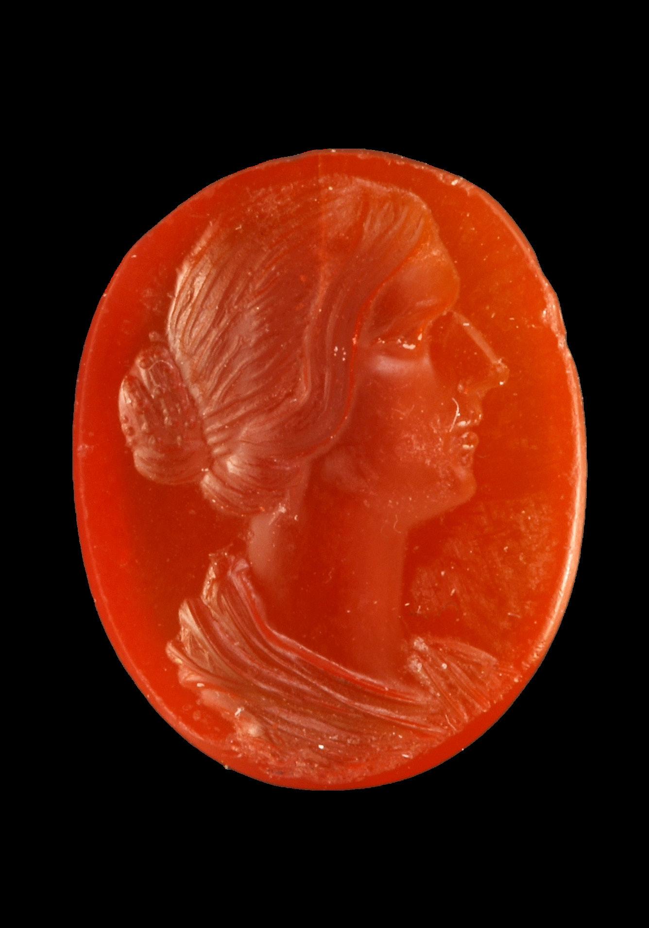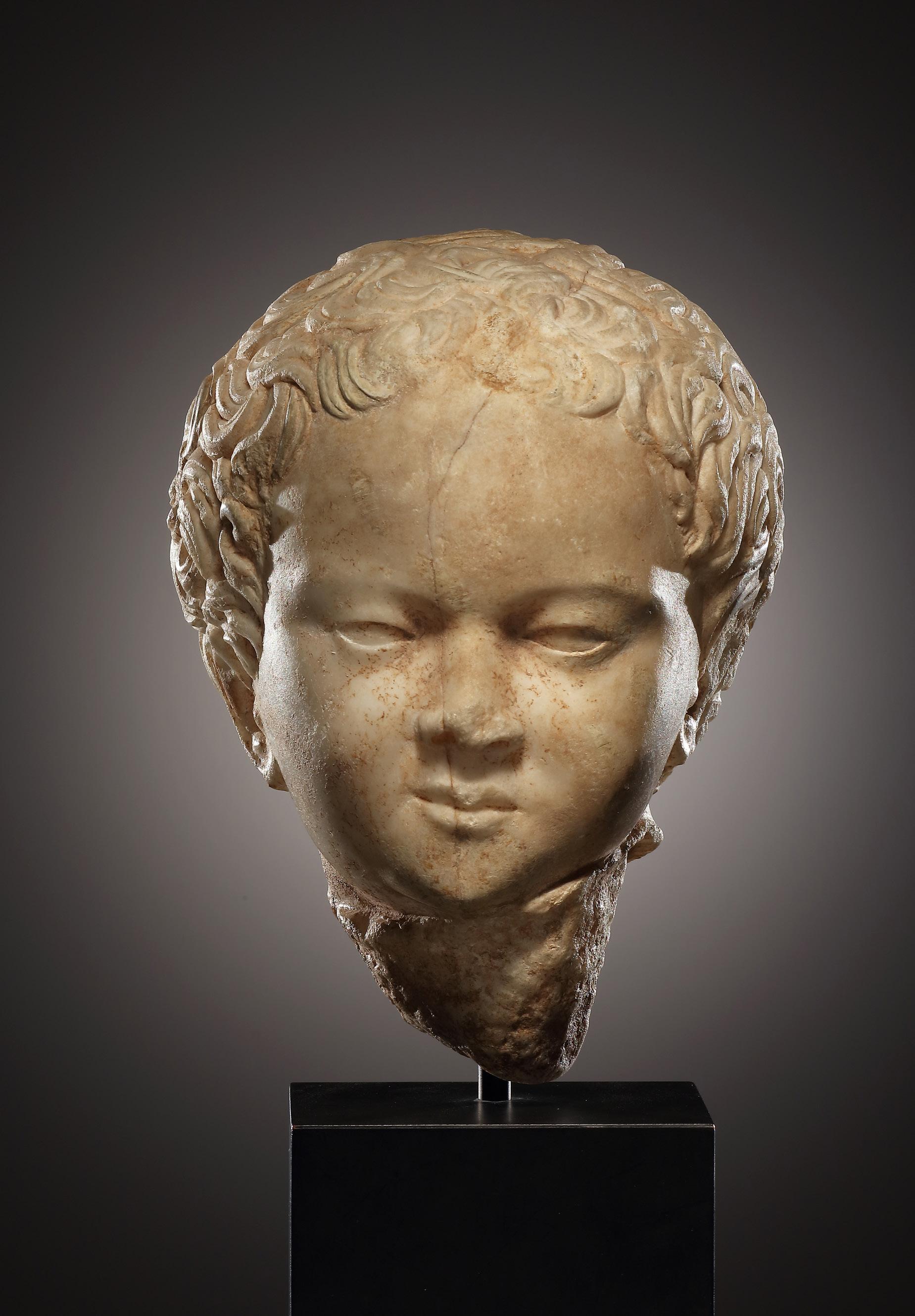 inserted into a statue and mounted with a slight turn to the left. At the front, the tang extends up to the chin, suggesting that the garment, presumably a cloak, reached up this far. The expression and structure of the face are reminiscent of the socalled Arktoi, statues of young girls that were donated to the sanctuary of Artemis in Brauron in the 4th cent. B.C. However, the shape of the eyes on our head differs markedly. Furthermore, the marble sculpture has a “metallic” quality that is particularly evident in the way in which the eyelids and the crescent-shaped curls are carved. It is, therefore, worth considering whether our boy was based on a Greek bronze original. On the other hand, the strikingly pointed chin in combination with the pronounced cheekbones and