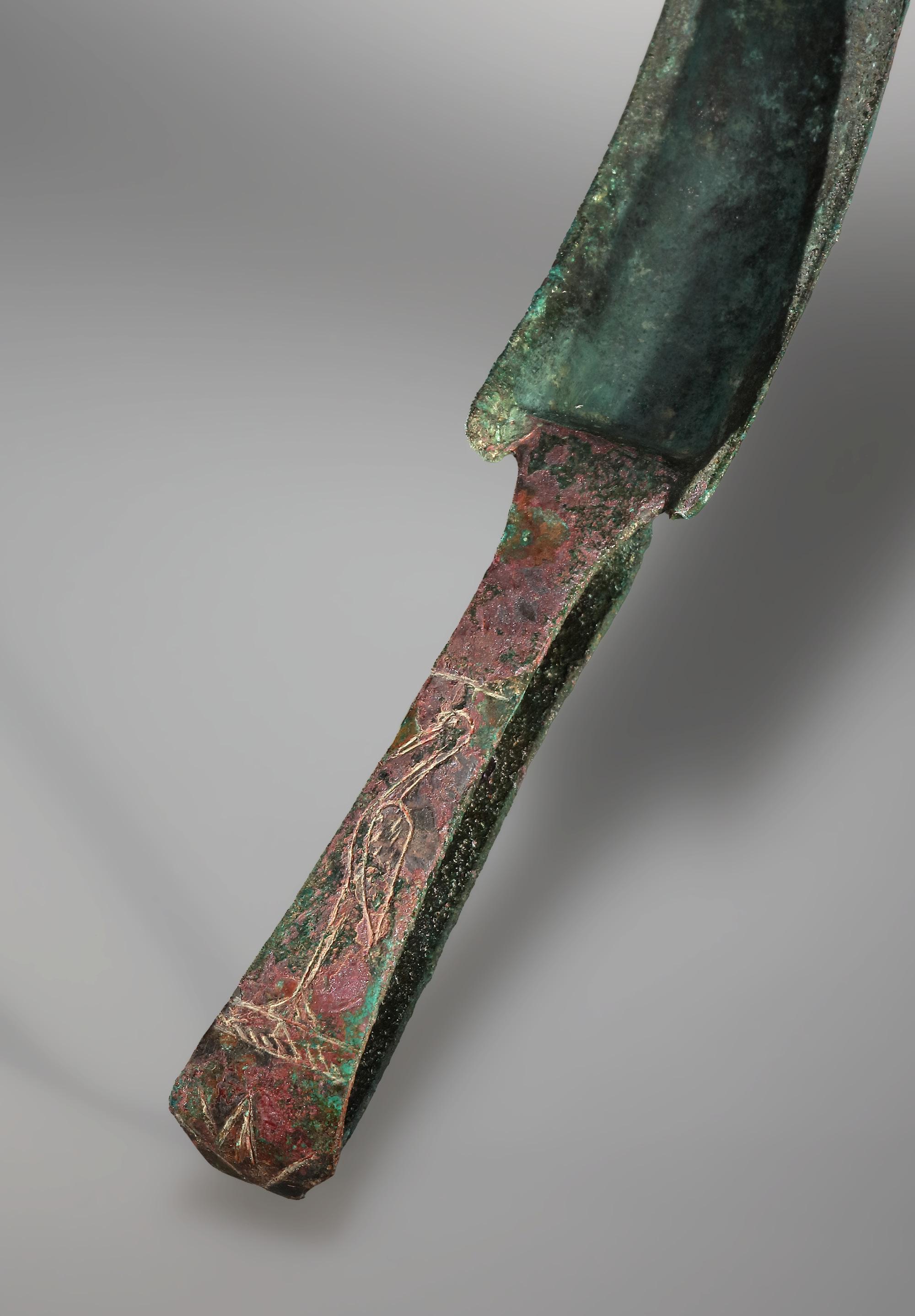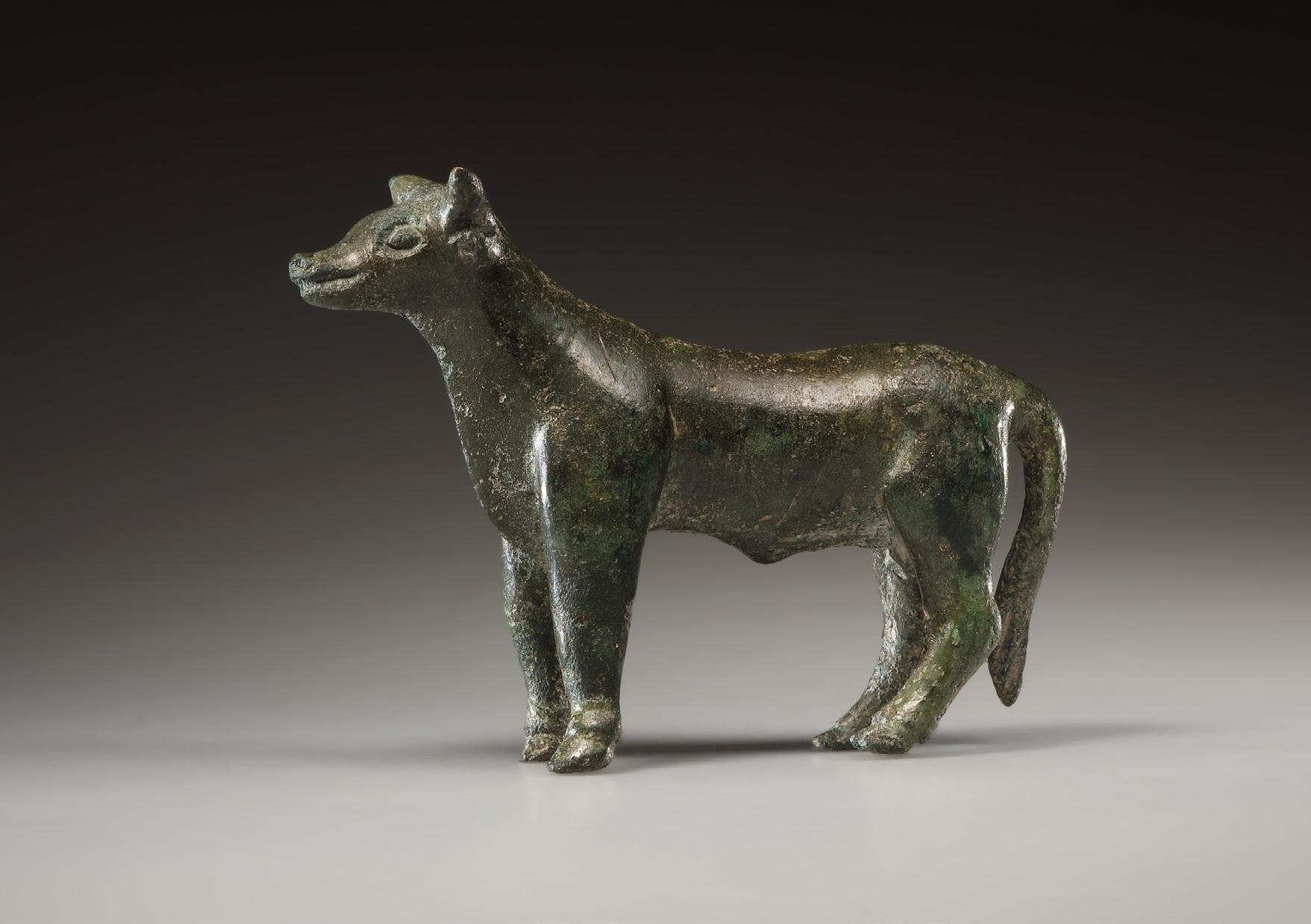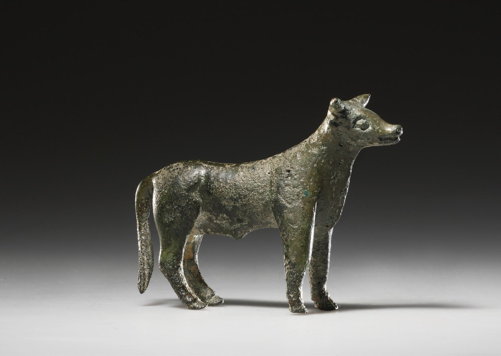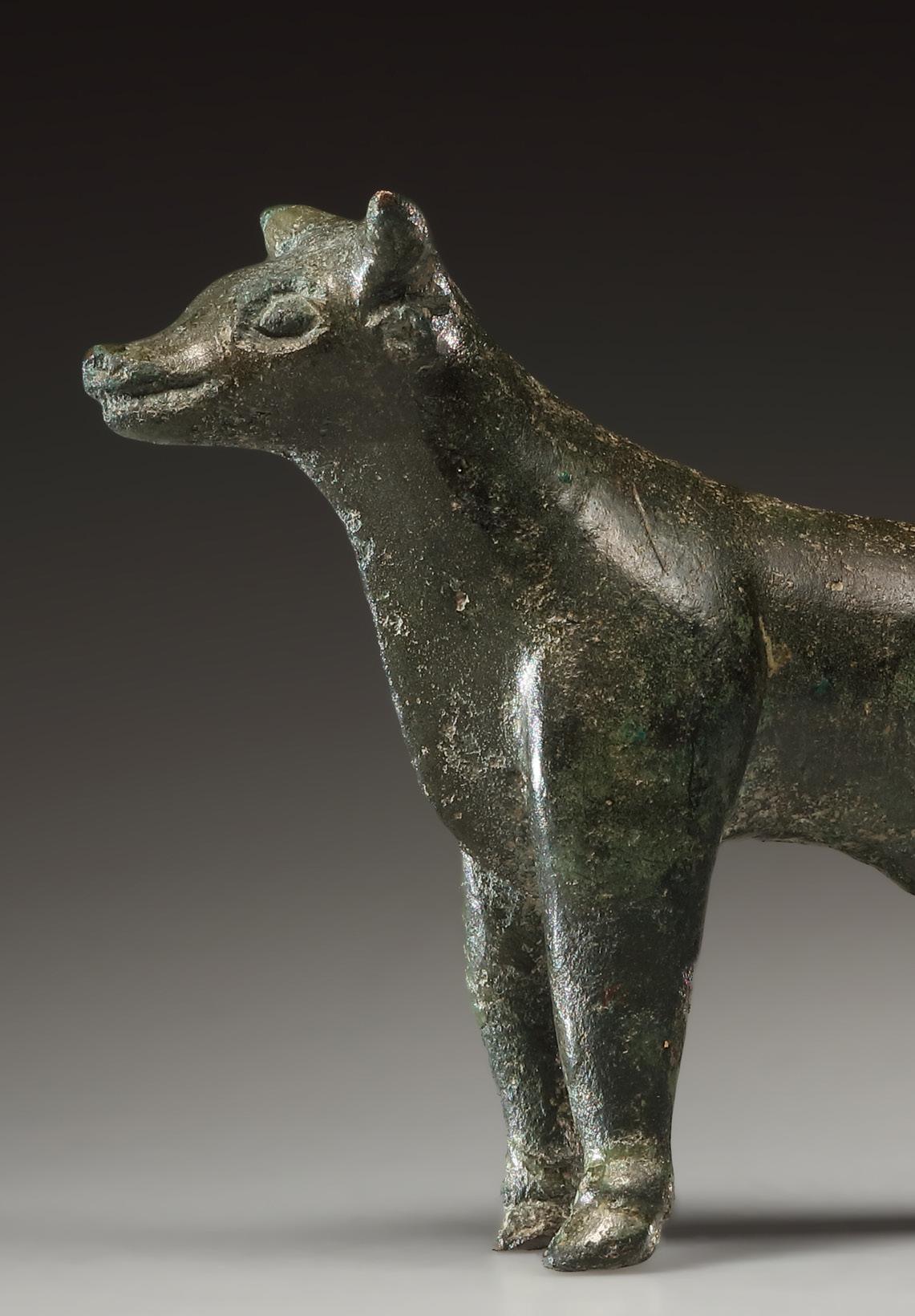 to the formal austerity of the body. The figure stands in the tradition of small Etruscan bronzes, that were produced from the 7th cent. B.C. onwards and were frequently dedicated as votive offerings in sanctuaries. The depiction of the nude male youth in the socalled kouros scheme follows Greek models and symbolizes ideal youth, beauty, and cultic purity. The figure probably represents either a deity (e.g., Apollo/Apulu) or a worshipper who dedicated the figurine as an offering to a god. Bronze statuettes of kouroi were also used in a decorative context, for example as supports for thymiateria (stands for burning incense; such a function, however, can be excluded here due to the fully modeled head). Part of the left forearm and the hand are missing. The beginning of