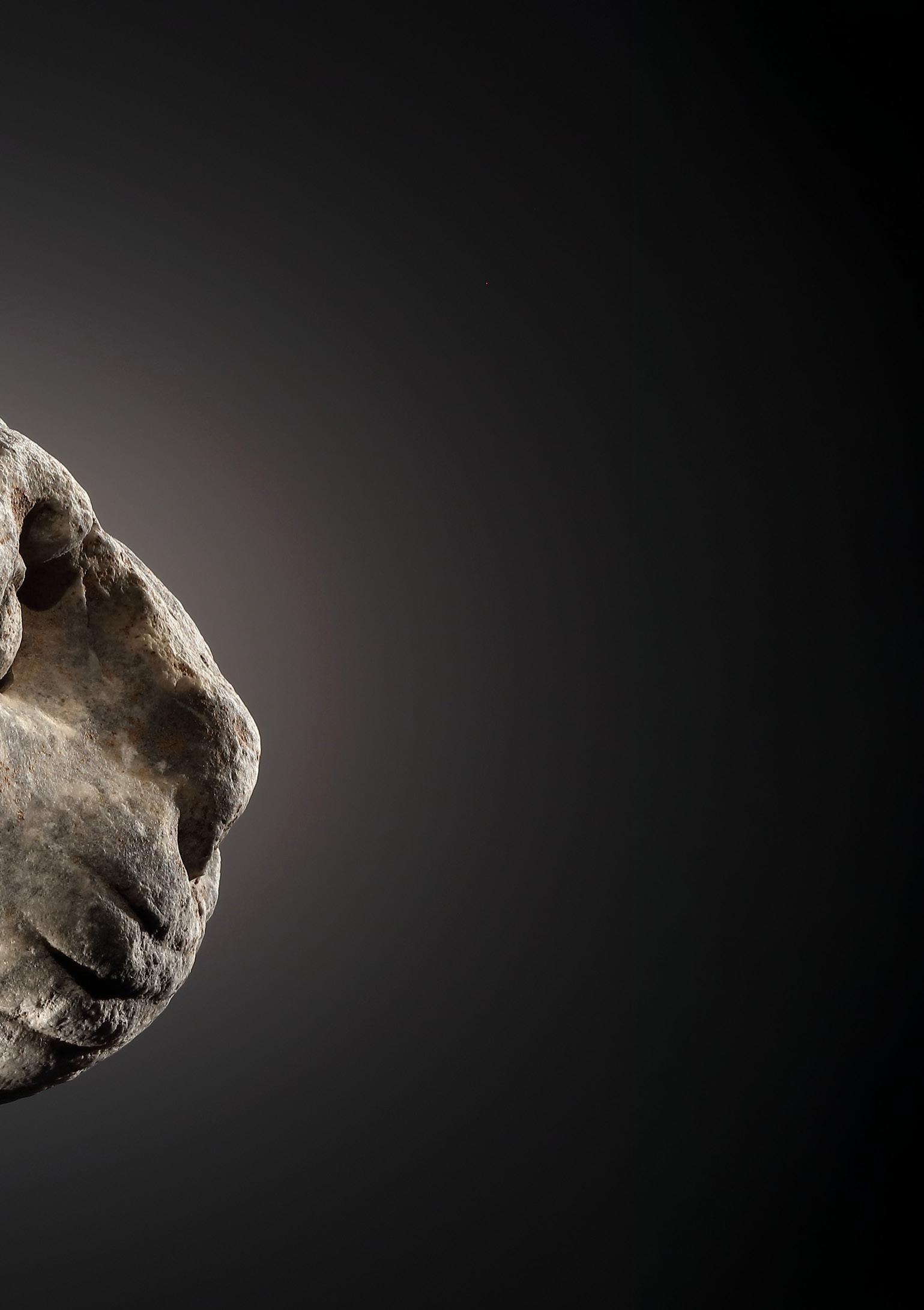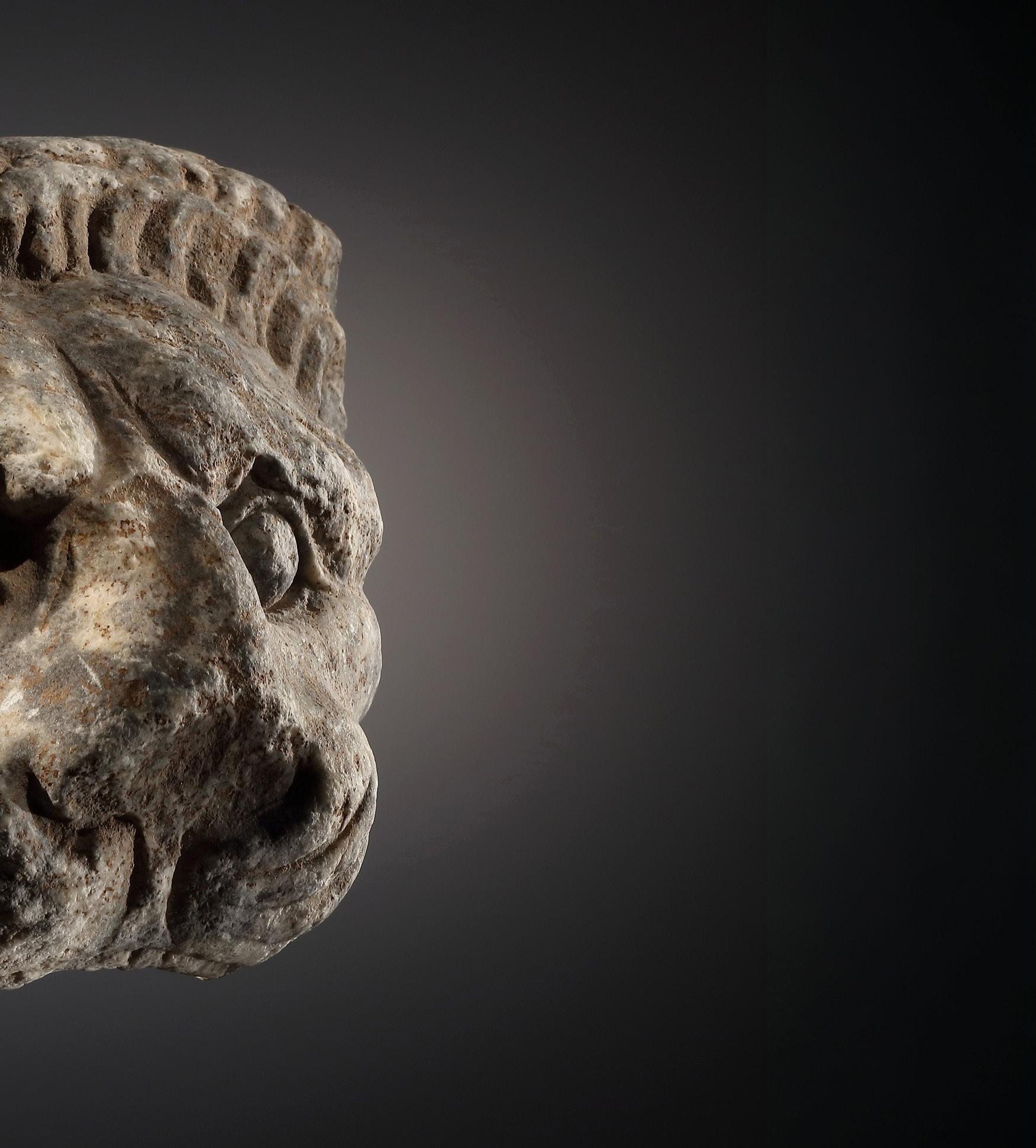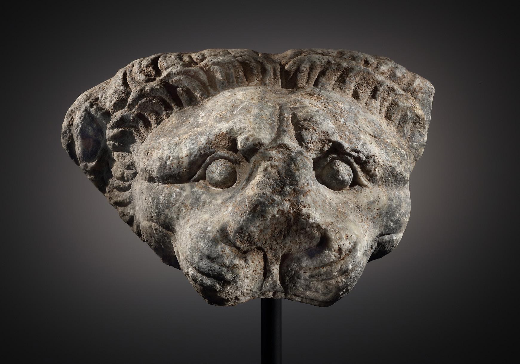 the sunken flesh around the mouth, is reminiscent of satyr depictions from the Imperial Period (cf. the head of a satyr in Castle Howard, Yorkshire). However, since the tip of the chin was filled in modern times, it is impossible to determine whether the current shape of the chin actually corresponds to the original state. Fine break through the face, extending from the chin to the middle of the top of the head. Slight surface losses at the ears. Some curls above the forehead, near the temples and on the top of the head restored. A few minor in-fills at the forehead, left eyebrow, left cheek and chin. Tip of nose, upper lip, ears and hair slightly worn.