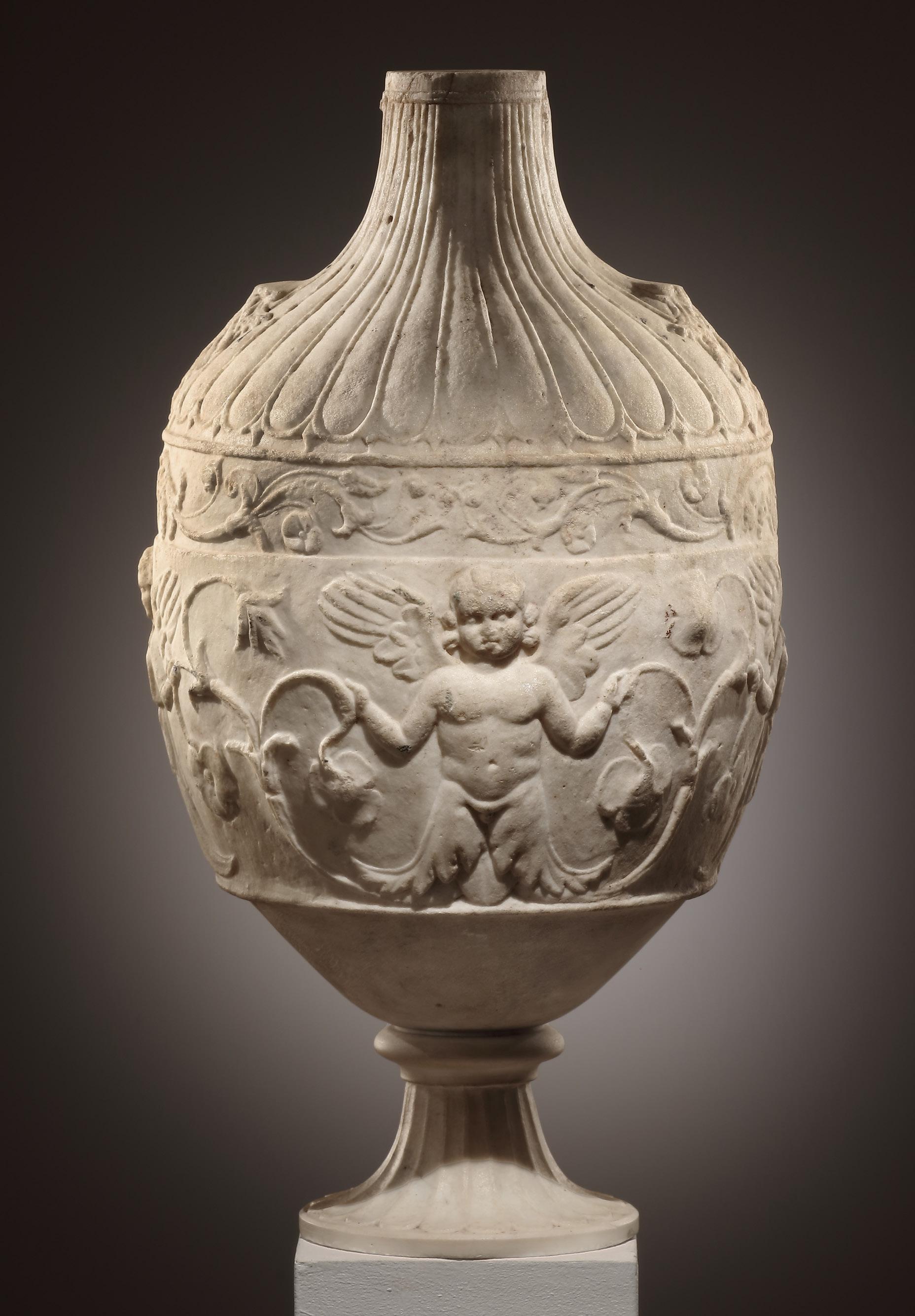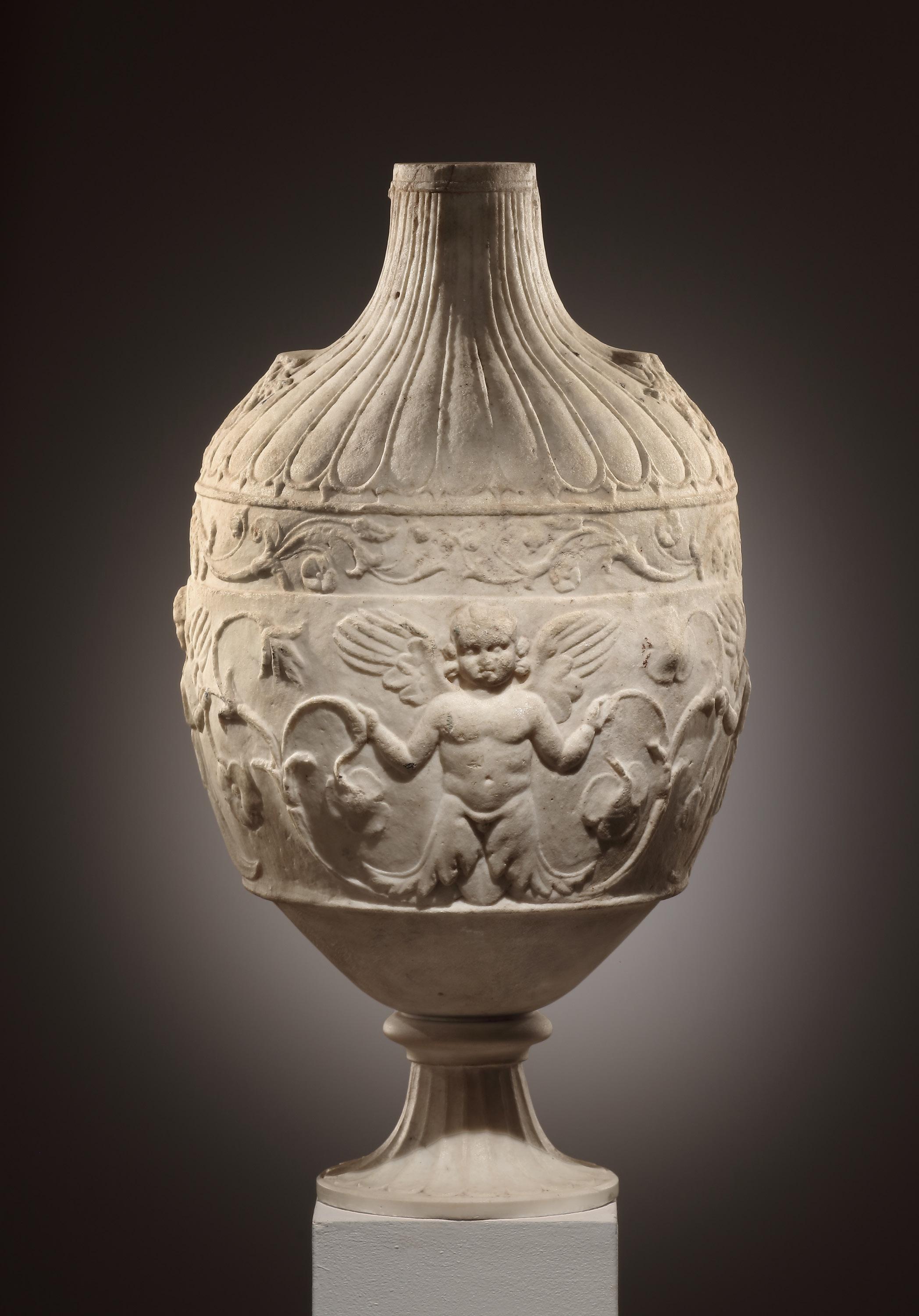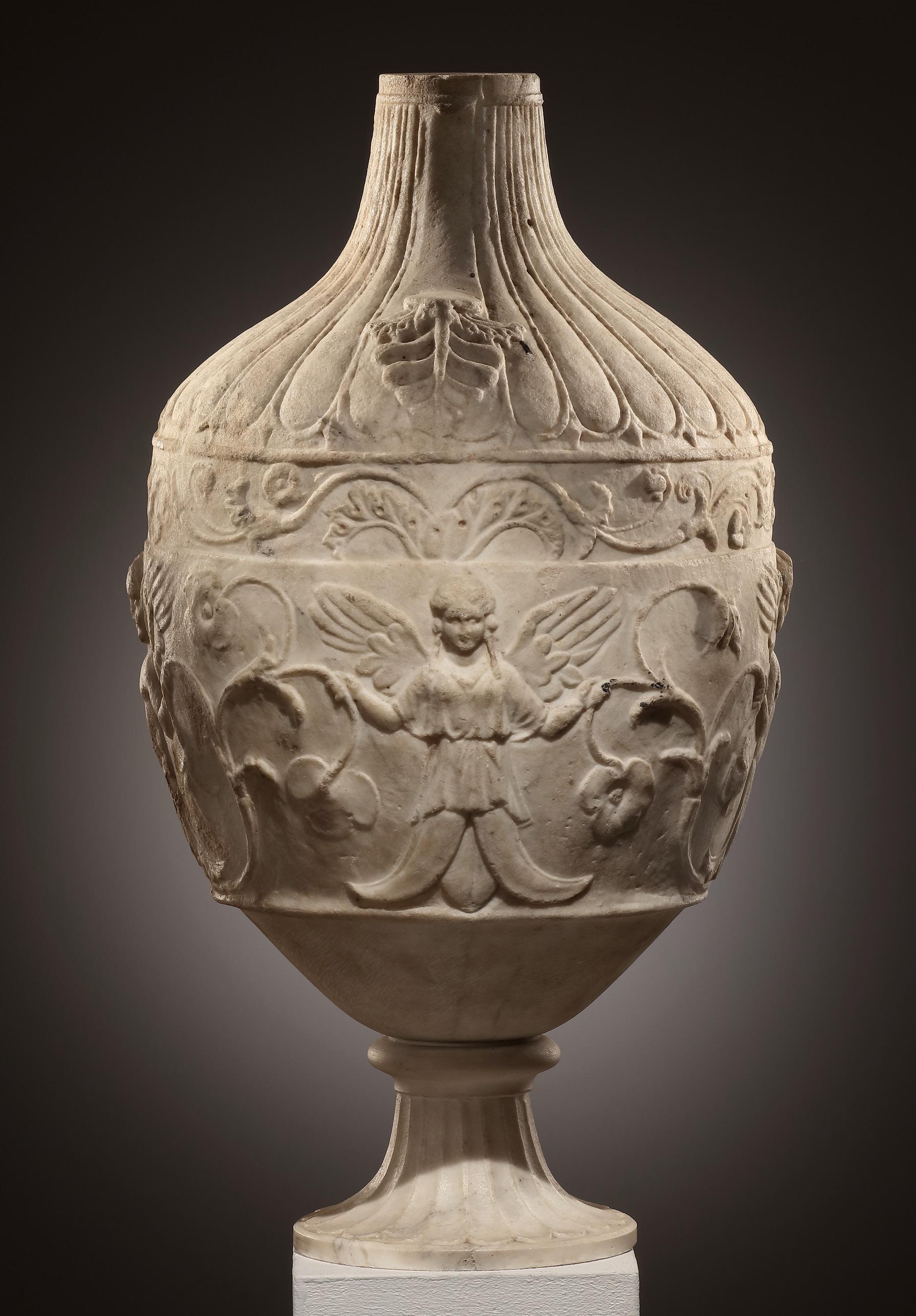 Finely carved marble vase in the shape of an amphora. The principal frieze on the vessel‘s body is sculpted in shallow relief with frontal figures, repeated, of Eros and Psyche, both winged and emerging, respectively, from acanthus leaves and a lotus flower, while holding aloft floral tendrils in each hand. Above, a narrow band of intertwining floral tendrils that rise from a base of acanthus leaves. The sloping shoulder is ribbed, with a pendant palmette at the base of each missing handle. A small, circular opening with a rill around it at the top of the neck. Ribs of neck, left arm of one of the Psyche figures and a tendril slightly worn. The foot has been restored in the 18th cent. Very close parallels can be found in a group of eight marble vases (four