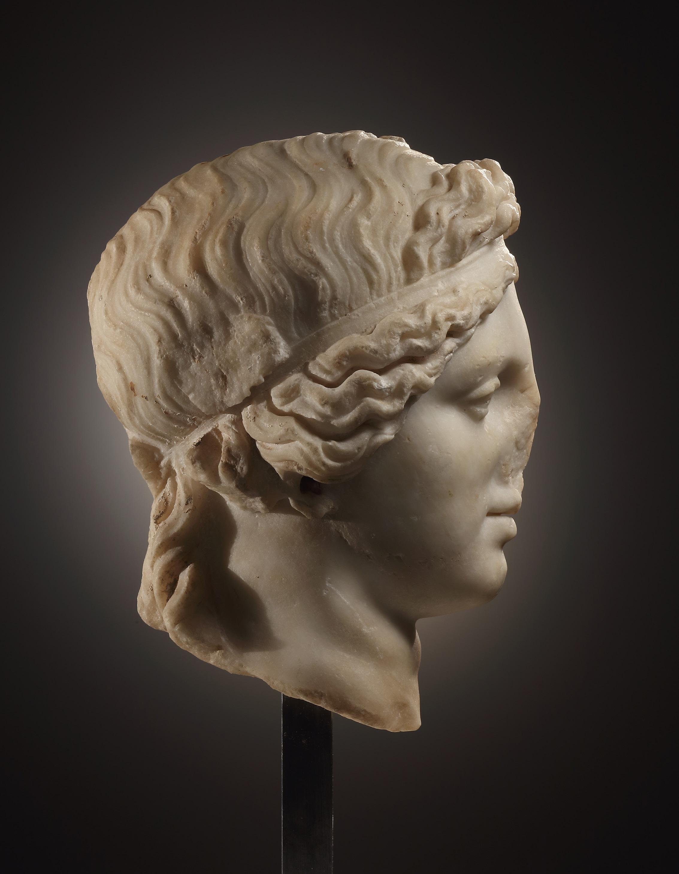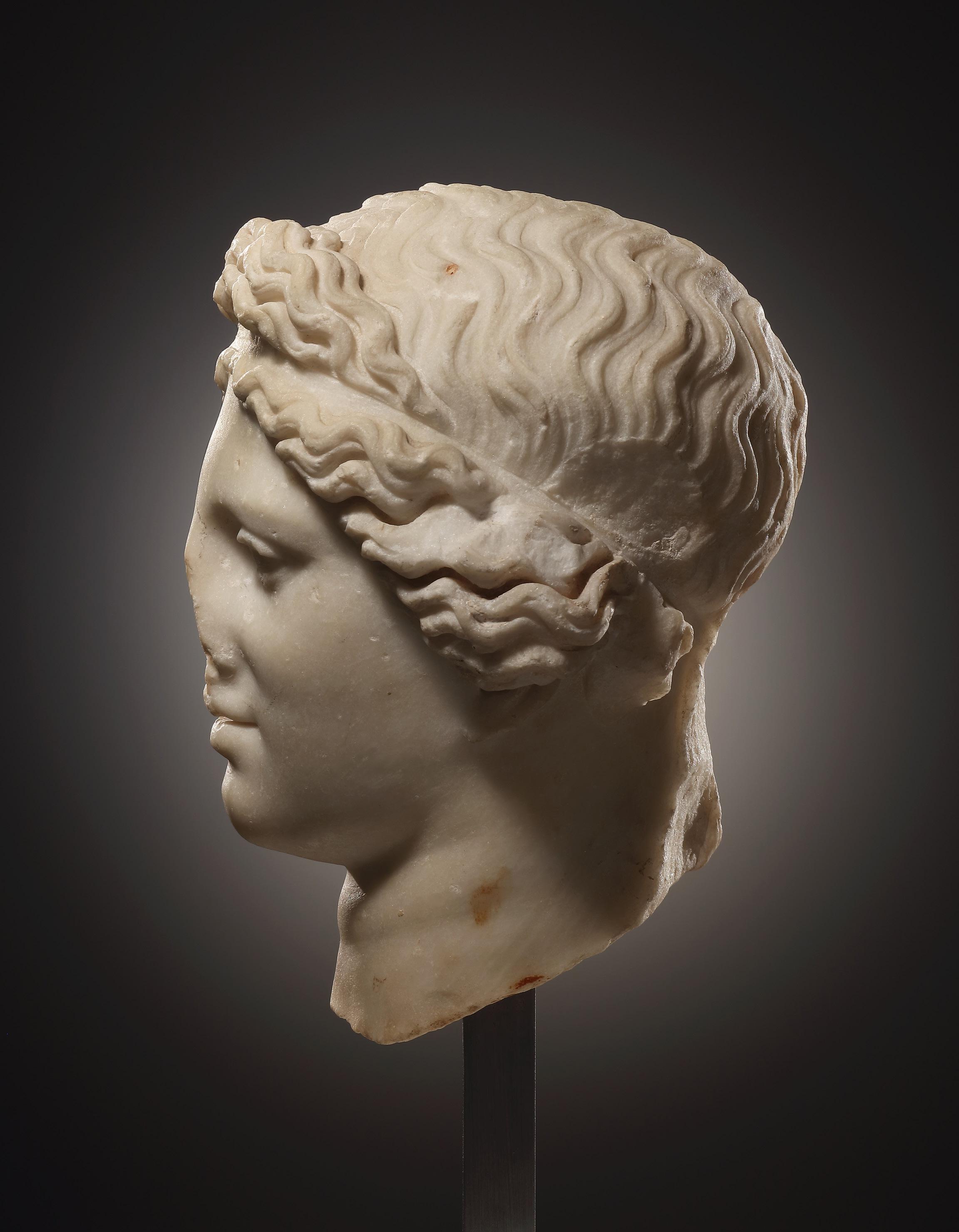 The youthful, idealised face is characterised by very fine, even features. Almond-shaped eyes with heavy, slightly drooping lids. The sensuous mouth is small, the opening marked by a deep groove. The wavy hair is parted in the middle and held in place by a fillet above the forehead. The ample curls, which half cover the ears, are drawn to the back of the head where they were once tied together and from where they cascade onto the shoulders in two long strands. Rings of Venus on the neck. Scaled-down Claudian marble copy of an original from the late 2nd or early 1st century