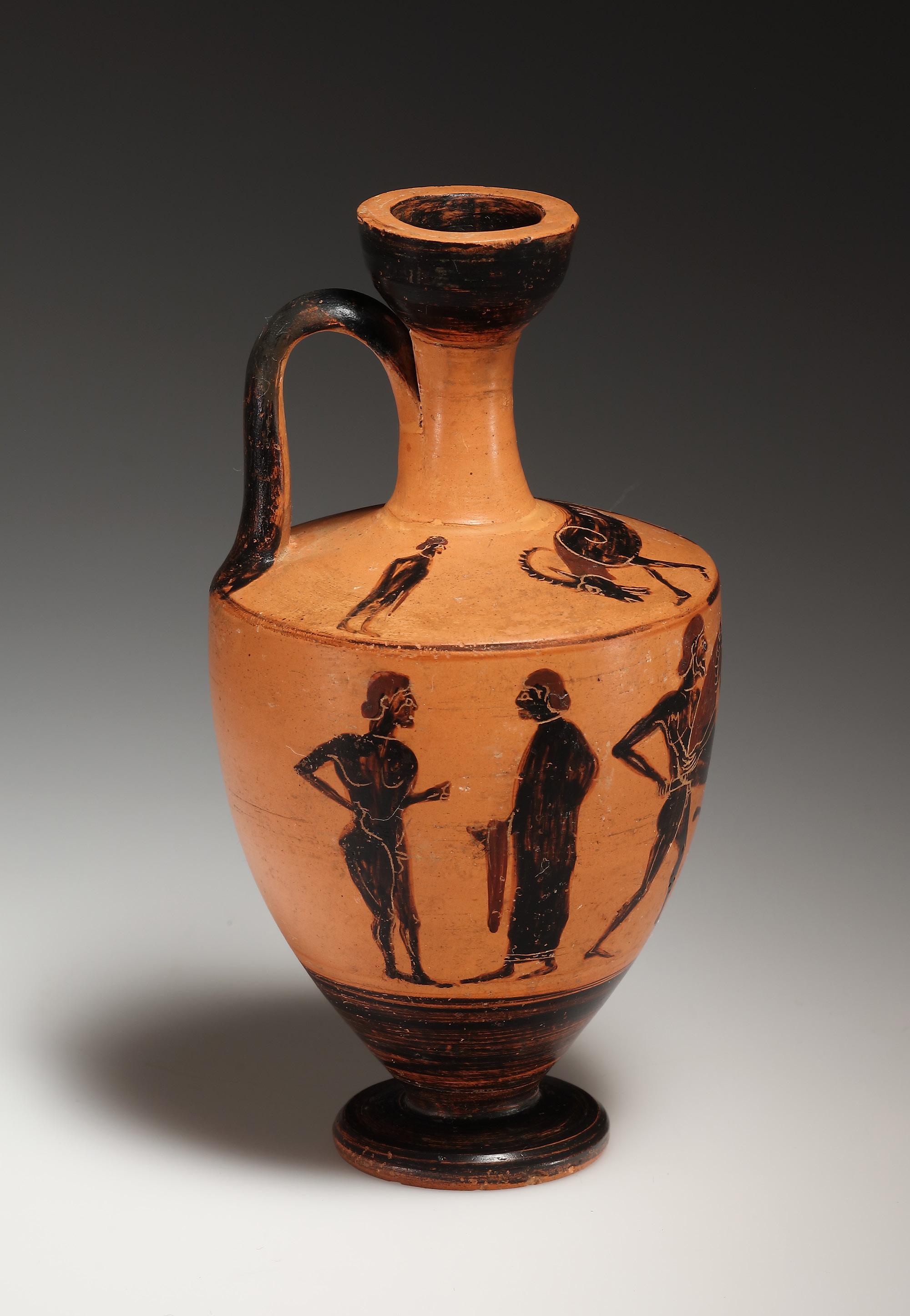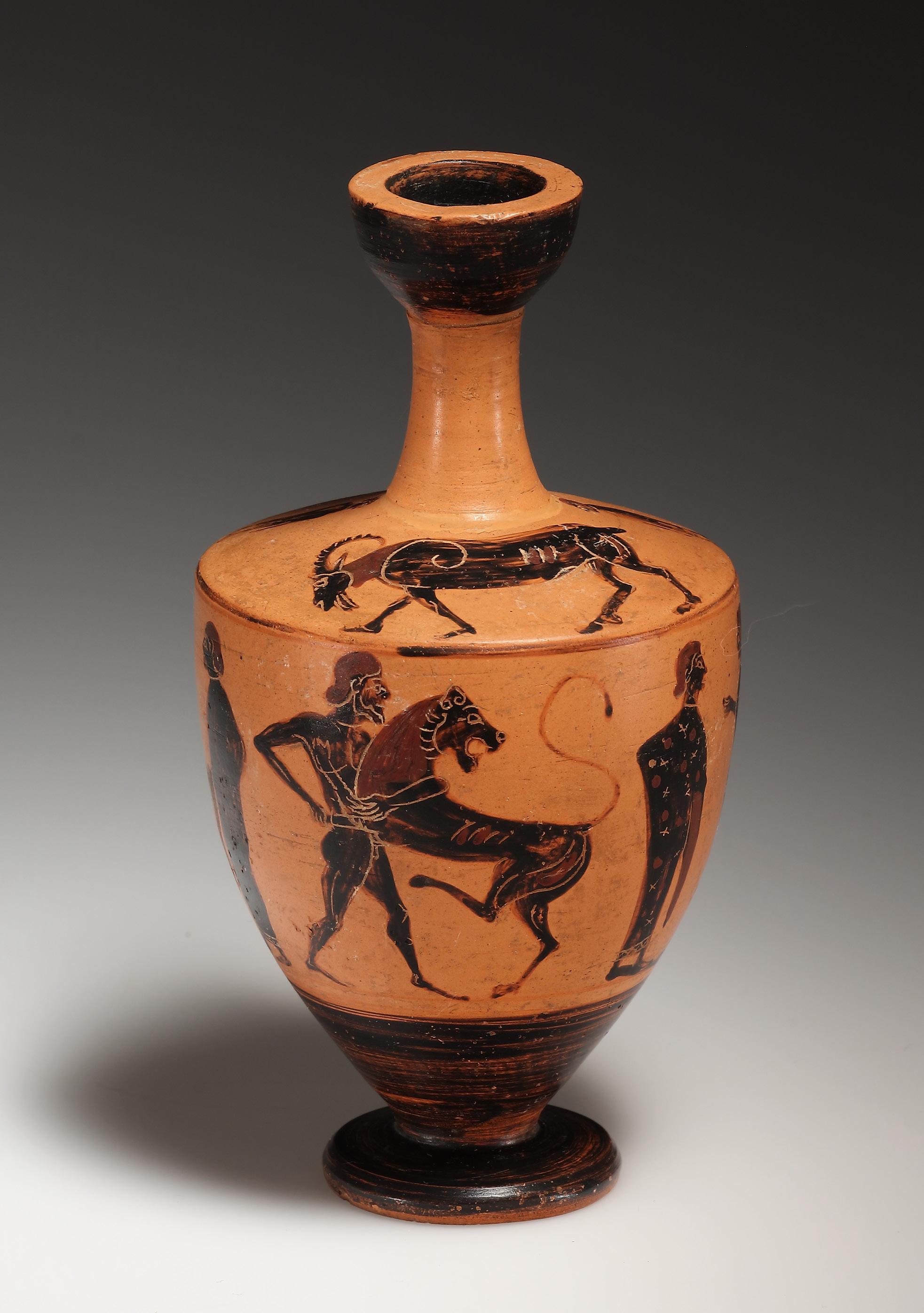 Black-figure shoulderlekythos, with a high neck that ends in an echinusshaped mouth. The body is broad and tapers noticeably in the lower part towards a thin discoid foot. The shoulder is wide and almost horizontal. It is decorated with a goat moving to the left, flanked by two draped onlookers. On the body, the scene depicts Herakles wrestling the Nemean lion. The hero faces the lion, seizing its neck in his left arm. The lion‘s head is turned away and it claws at Heracles with its hind paw. On either side of the combat scene stand two youths, one nude and the other clothed, facing one another. Black glaze on interior and exterior of mouth, outside of handle, lower part of body and foot. Incisions for eyes, ears, garments and anatomical details.