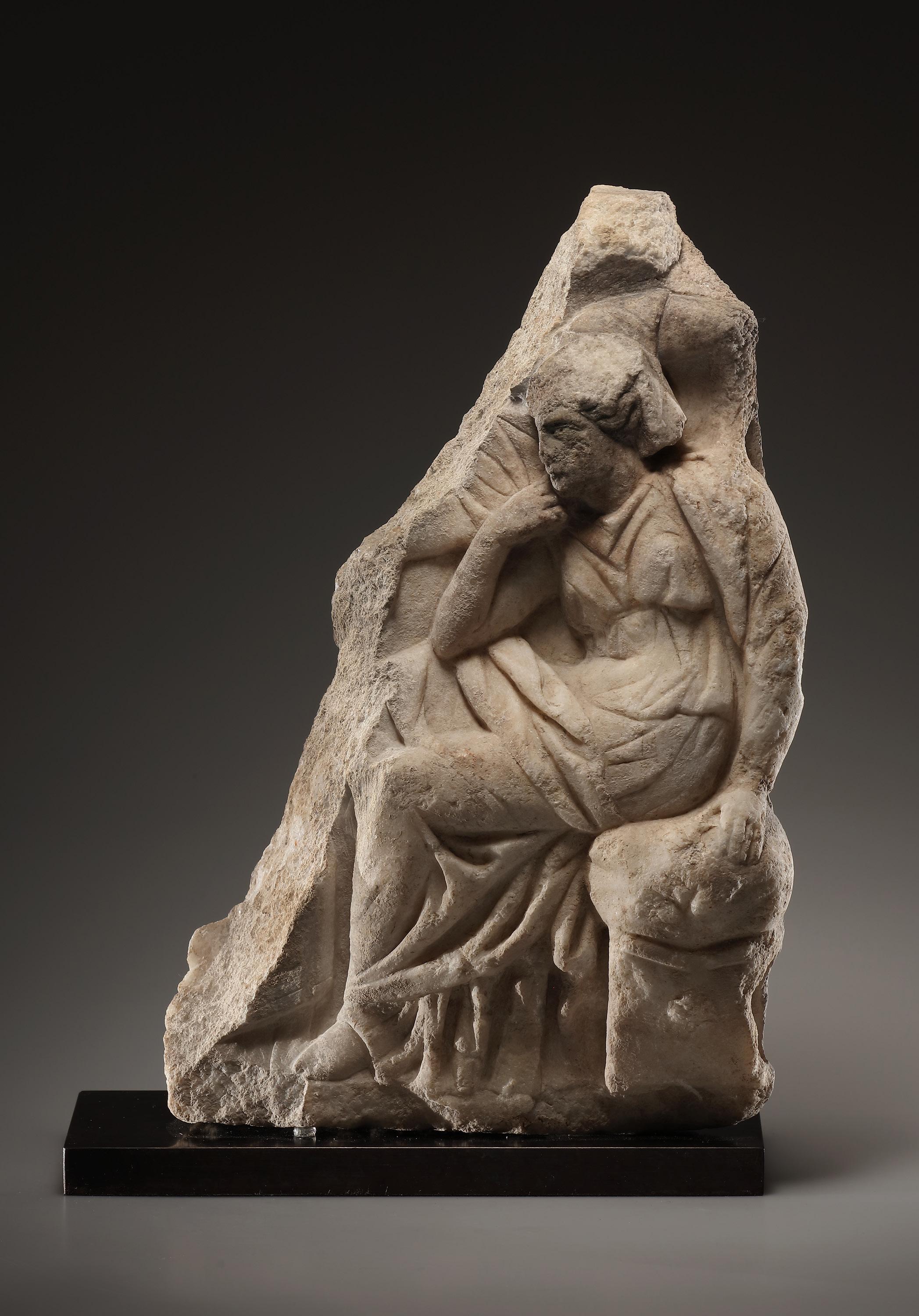 The fragment forms the right end of a relief or relief frieze that originally continued to the left. It depicts a young woman to left seated on a high cushion placed on an almost square stool with a slightly recessed upper edge framed by a moulding. The lower body and face of the young woman are shown in profile, while her upper body is rendered in threequarter view. She wears a long chiton, belted below the breasts, and a mantle that is draped over her left shoulder and around both legs. Her left hand rests on the cushion. Her right arm is sharply bent, the elbow resting on the raised right thigh and the hand brought to her chin, as if lost in thought. The seated pose and attitude recall similar depictions on Greek funerary reliefs. The young woman’s head