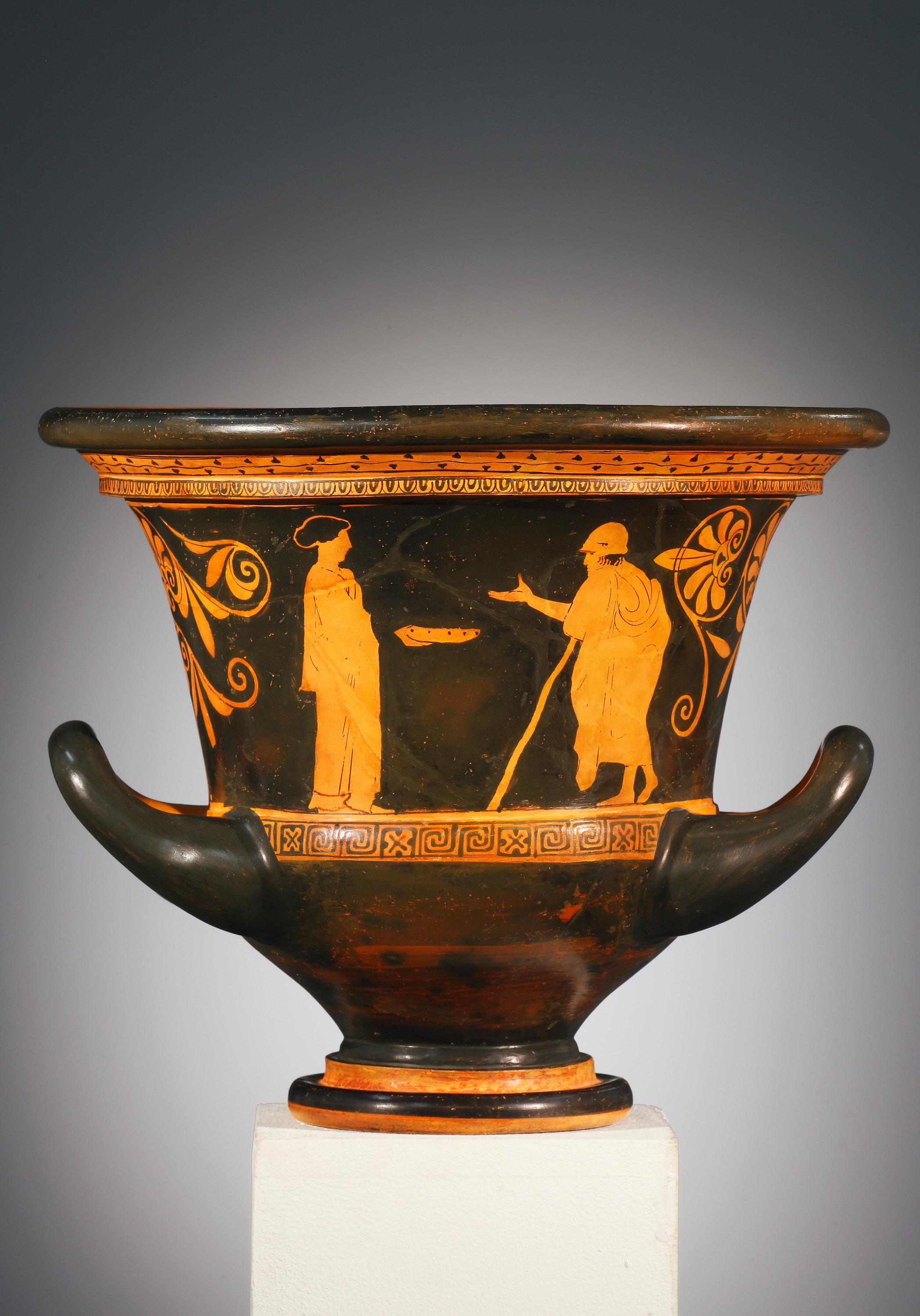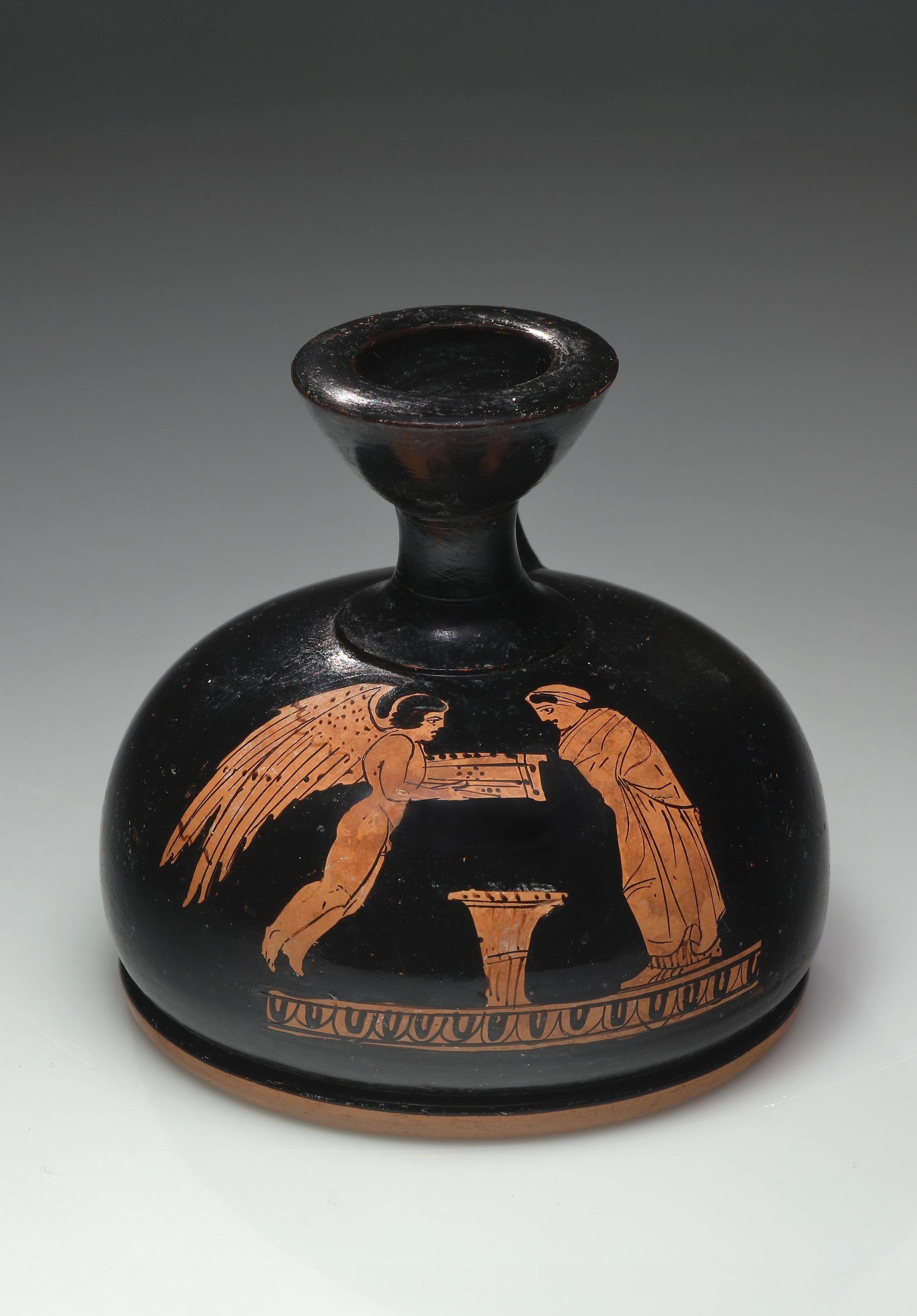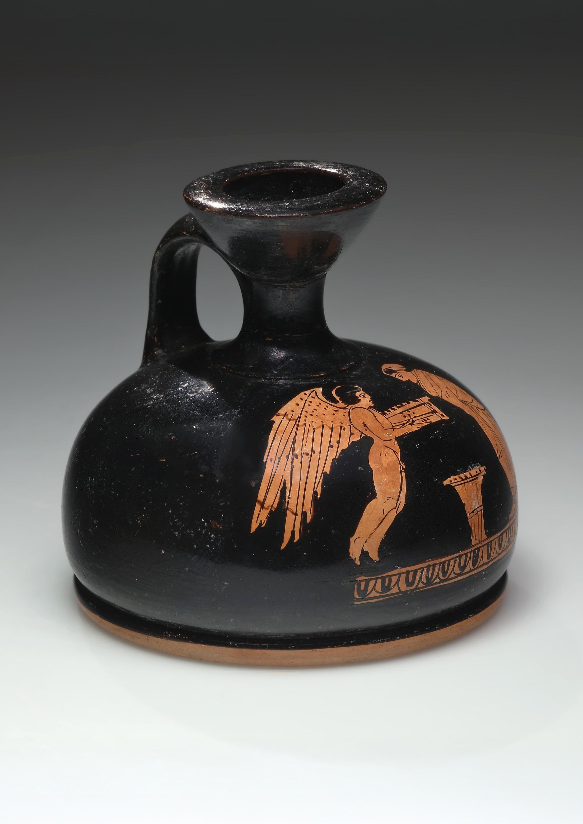 The ovoid body of the loutrophoros is decorated with alternating broad and narrow ribs which are separated by incised lines. The slender neck is framed by two tall handles with inward-rolled volutes. Those at the top of the handles touch the neck whereas the smaller ones at the bottom rest on the body. Only the obverse of the volutes are worked in relief, indicating that the vessel was meant to be viewed on one side only and was perhaps placed in a niche. A separately made lid serves as the upper termination of the vessel. In the wedding ritual, loutrophoroi, many of which also survive in terracotta, were used to fetch water for the bridal bath. They also played an important role in funerary contexts and in the rites associated with them. Clay