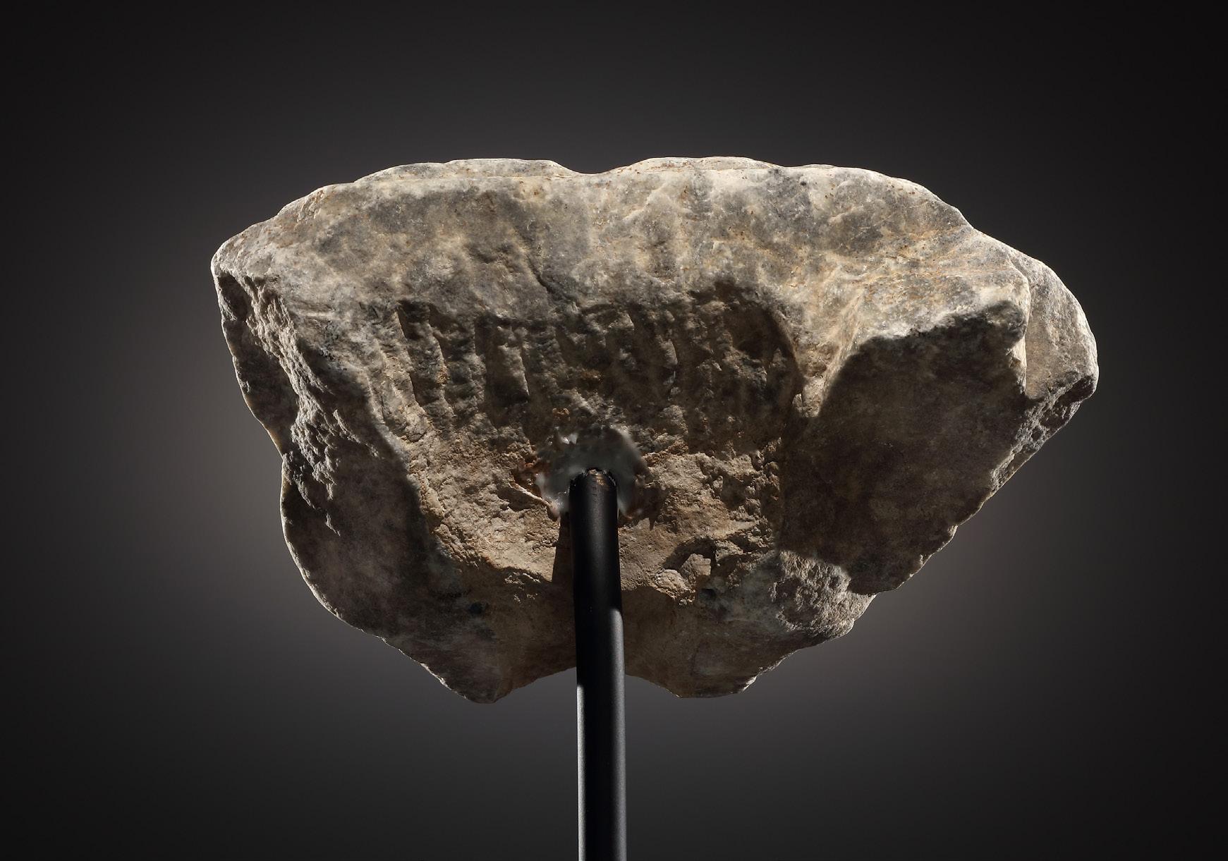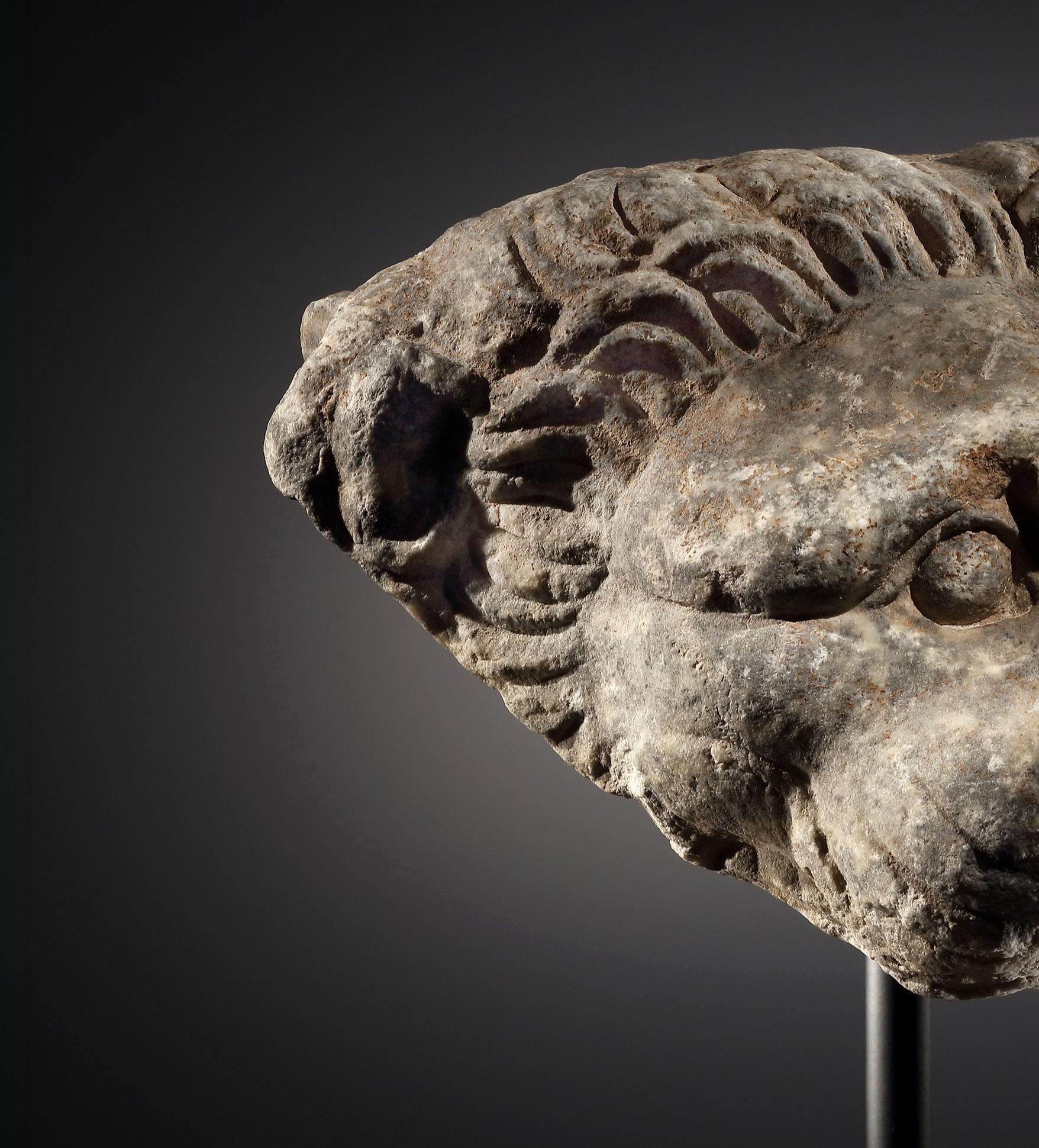 to the curved upper row of teeth that mark the end of the water channel. Three curved grooves on both sides for the whiskers. Behind the mane there is an area that is flattened at the top. Possibly, it is the base of the sima. A chiseled edge behind the ear. The reverse has a shallow cavity in the centre which transitions into a shallow groove beneath the upper jaw. Sinter deposits in this area, presumably from the passage of water. Lower jaw lost or not sculpted from the outset. Slightly worn.