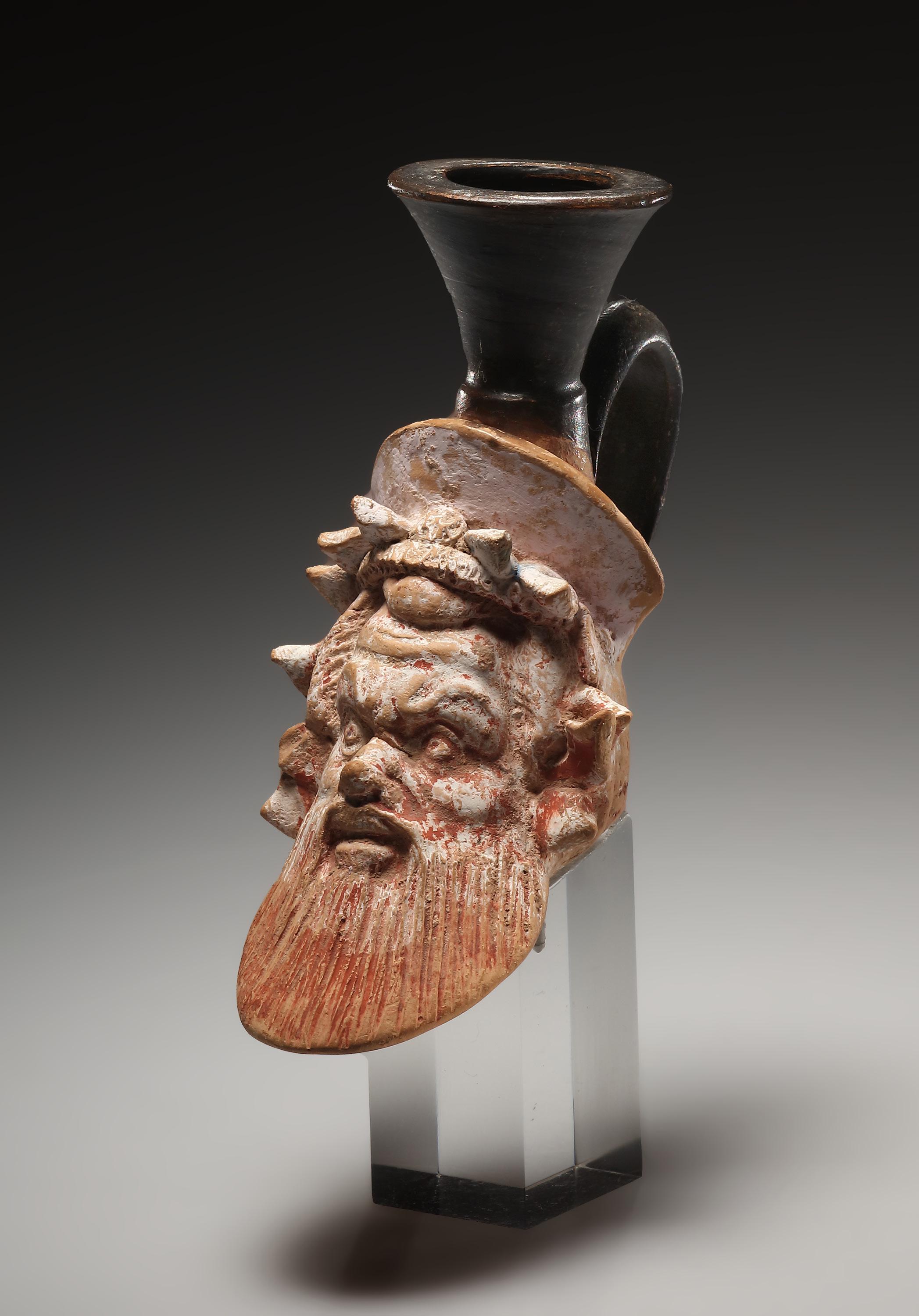 A Corinthian Round Aryballos with Helmeted Head