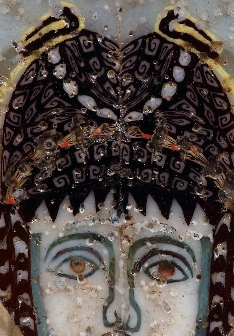 For the mask type, cf. a mask on the so-called Six Mask Cup from the Hildesheim Silver Treasure (late 1st cent. B.C.- early 1st cent. A.D.), U. Gehrig, Hildesheimer Silberschatz aus dem Antikenmuseum (Berlin 1980) 17 with fig. 15. There, the ivy-wreathed mask is identified as Dionysus. Representations of masks were popular in the Roman art and were used in a wide range of genres and monument types. Such ubiquity attests to the high importance that the theater, with its distinct modes of expressiontragedy, comedy, and satyr play - held in people’s lives. The presence of teeth, an element seldom found in theatrical masks, is unusual.