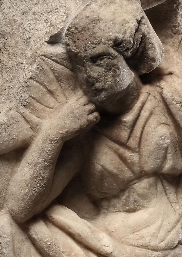 appears to be covered with a short veil, from beneath which a few wavy strands of hair emerge at the sides. The upper body of another figure is visible behind her. The person leans forwards; the left arm is bent and the hand rests on the shoulder of the seated woman, while the right arm seems to be extended forward. As far as can be discerned, this figure wears a loose garment with short sleeves. Only part of the lower edge of the cloak of a third person standing in front of the seated woman is preserved. The upper and lower edges of the relief are preserved, albeit slightly chipped. The dimensions of the relief and the manner in which the reverse is tooled suggest that the fragment once belonged to the lid of a sarcophagus. A corner acroterion may originally