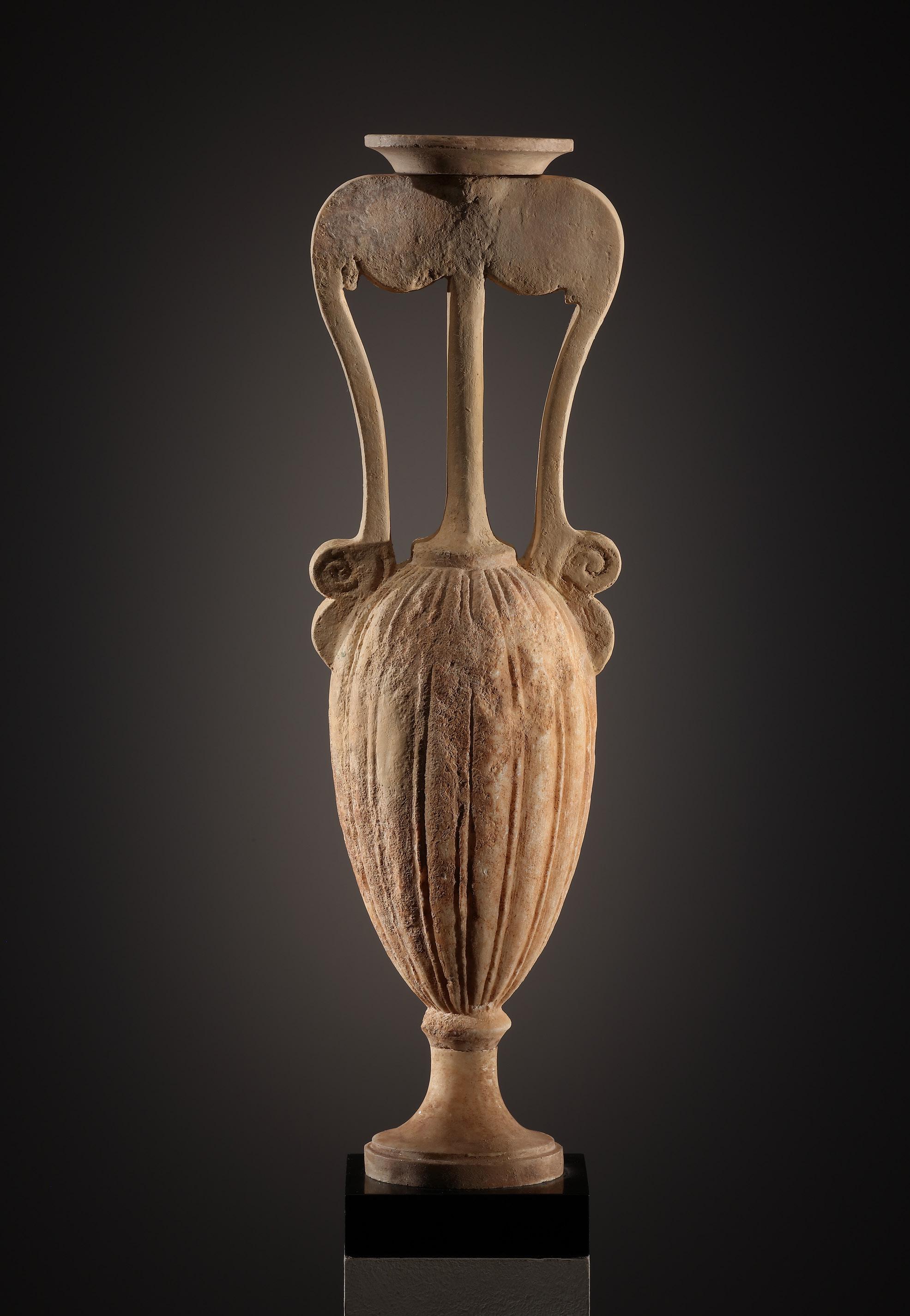 loutrophoroi were placed in the graves of unmarried deceased individuals of both sexes. Graves were marked by marble loutrophoroi that were often large or even monumental in scale and which were decorated with figural or ornamental motifs. They are also occasionally depicted on grave stelae. Small-scale loutrophoroi like our specimen are rare and may have been placed on a trapeza, a type of funerary table in the form of a marble block with profiled edges at the top and bottom. Examples are known from the Kerameikos (cf. a loutrophoros from the grave precinct of Philoxenos of Messene; Athens, Kerameikos Inv. MG 47). An interesting detail is that, on one side of the body, the central rib is somewhat broader and flattened as the incised lines were