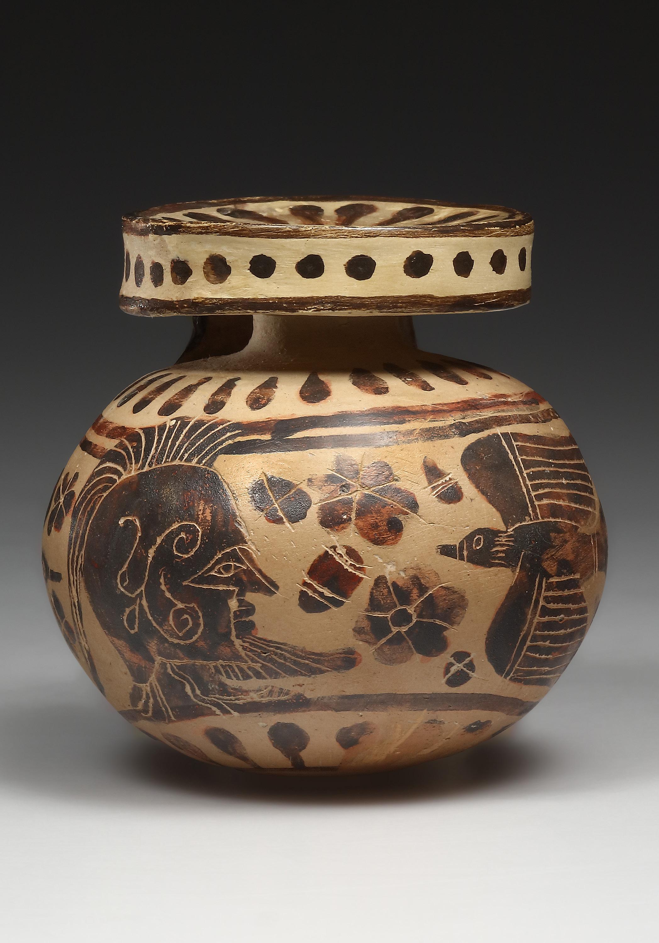 A spherical aryballos (H. Payne shape B 2) with a discoid rim and a vertical strap handle. The lip is decorated with tongues. Dots on the rim. On the body, a helmeted head to right is flanked by two birds in flight, converging towards it. Filling ornaments consist of blobs and rosettes. Above and below the main picture are bounding lines and tongues. The motif of a helmeted head flanked by two animals emerges during the late phase of the Corinthian ceramic development, and appear in the production of the Winged Lion Painter. However, this work cannot be ascribed to this artist. The painter‘s attention to detail, especially the careful outline of the profile eye, the scroll motif on the helmet, contrasts sharply with the Winged Lion Painter‘s rather cursory