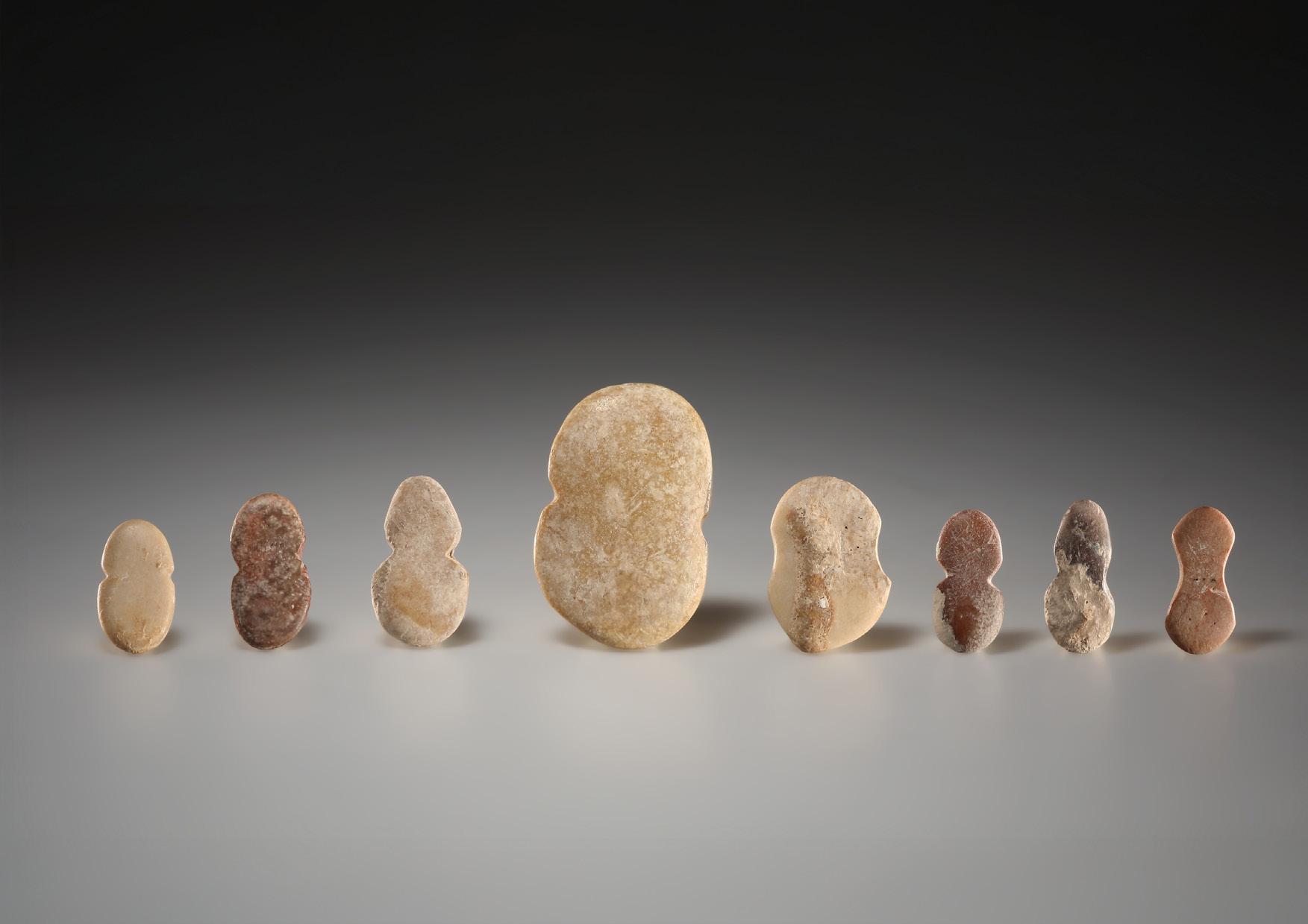 Form-typologically related group of eight abstract-schematic, almost violin-shaped idols, none of which are exactly alike. All are flat and have either a notch or a concave constriction in the middle. One idol with an neckline that resembles those found on idols with engraved faces belonging to the next stage of development. These later idols make it clear that even our undecorated type imitates the human form in a rudimentary way. Our idols belong to the Trojan type, which is widespread in northwestern Anatolia. In scholarly research, it is generally assumed that these abstract idols were used in cult rituals. Surfaces polished on both sides. Two specimens with slight sinter deposits.