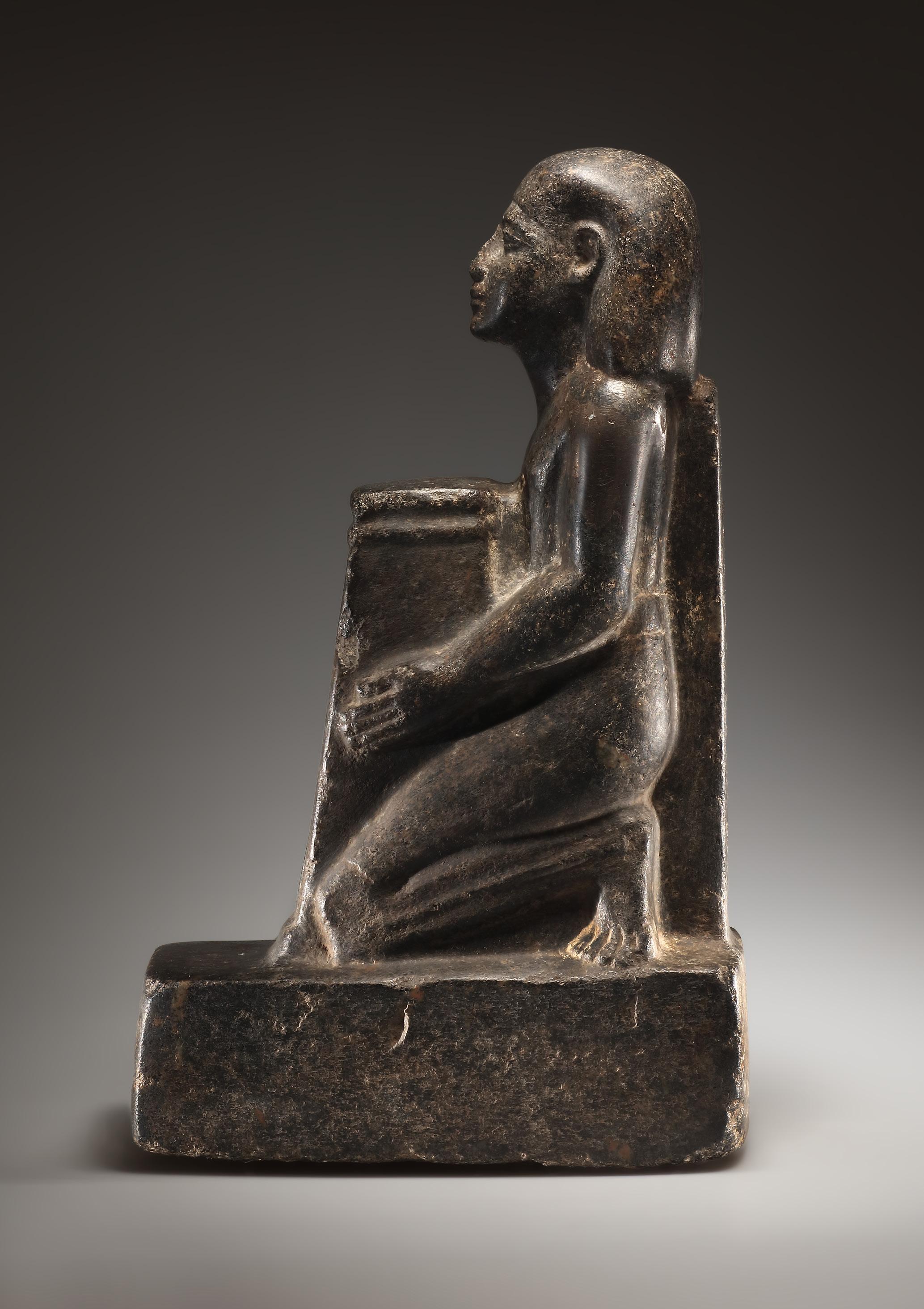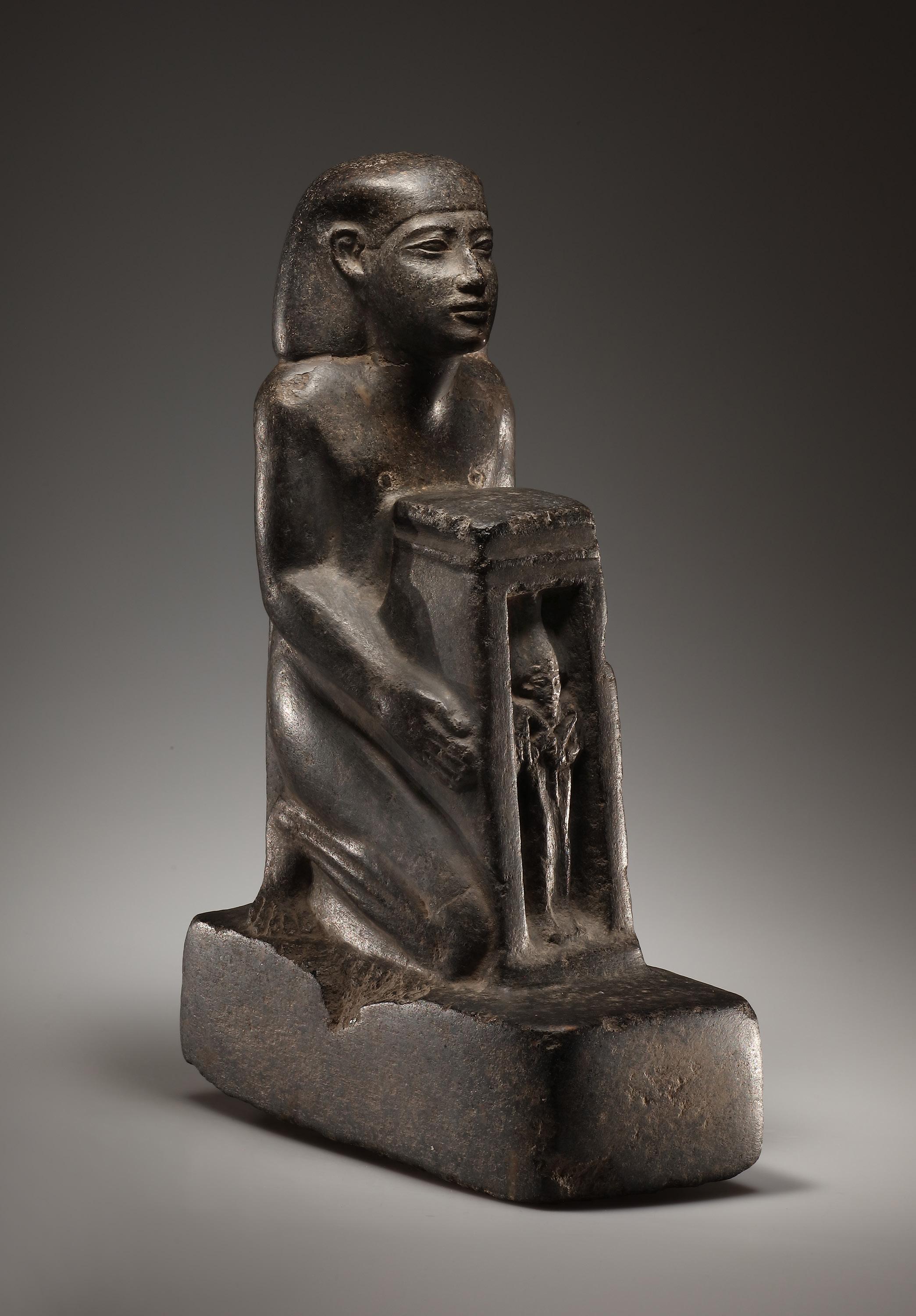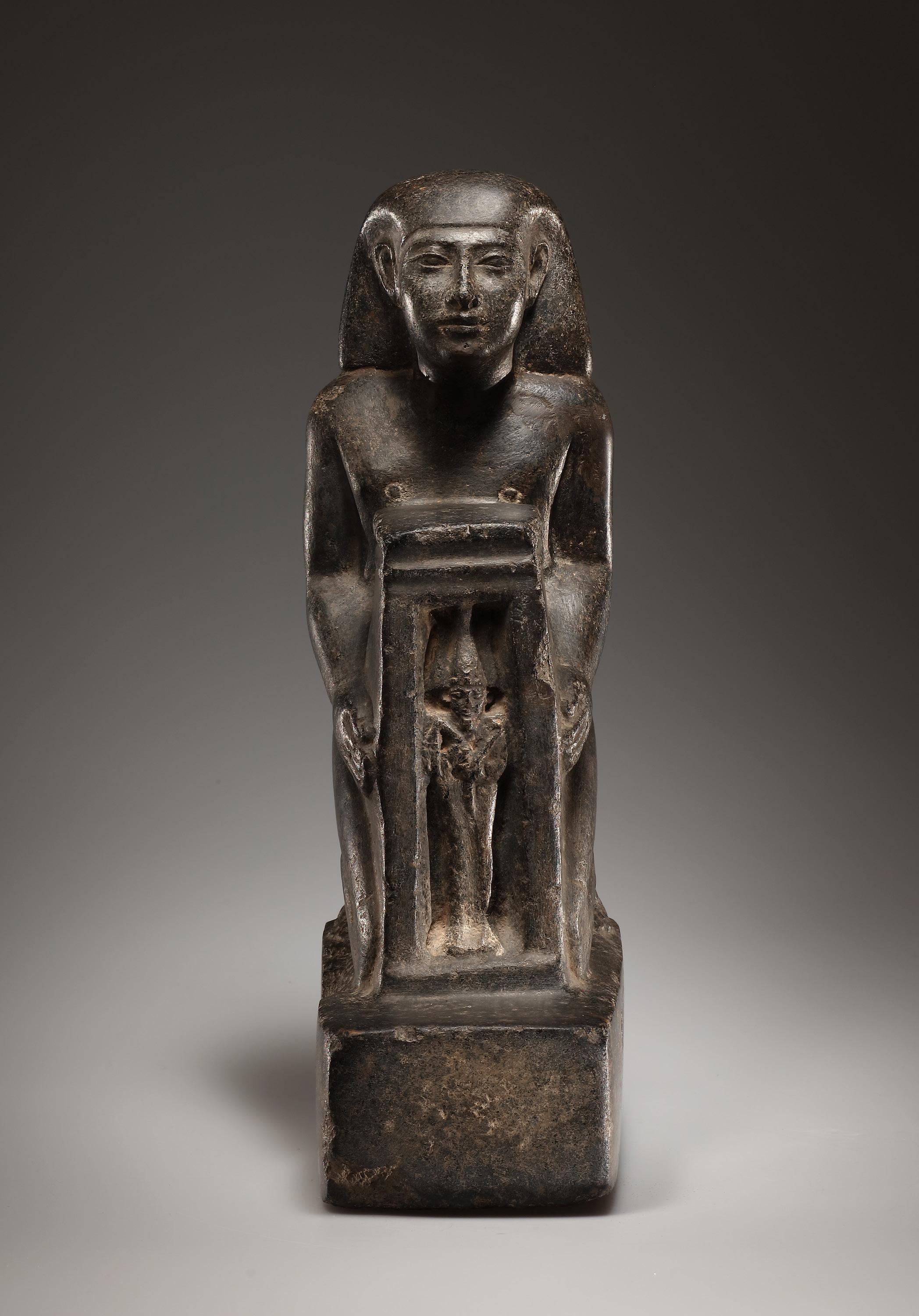 A male figure wearing a smooth kilt kneels on a rectangular base with rounded edges. He slightly raises his head that is covered by a wig. The facial features are carefully carved. The kneeling figure holds a naos containing a representation of the god Osiris. The dorsal pillar rises to the nape of the neck and is inscribed with hieroglyphs: „Osiris-Seti, may he be granted life, in every place of Neith, Chenti-Tep-Anch, so that his Ba may be glorified“ (rest not preserved). The naophoros, or naos-bearer, is a statue type that was introduced in the 18th Dynasty and was widely adopted in the Ramesside Period. Inscriptions from the Late Period explain the meaning of this image: by embracing or supporting the shrine, the donor shows that he wishes to protect to the