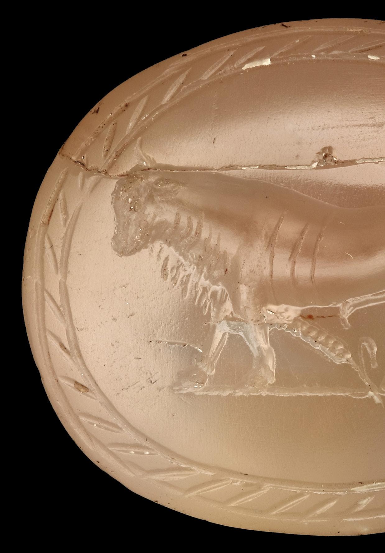 have risen up behind the seated figure. Due to the fragmentary preservation of the scene, its interpretation is difficult. As the three figures are clearly interacting, a mythological scene may have been depicted. Given the veil and the distinctive gesture of the right hand, the seated woman is certainly not merely a passive or peripheral figure. The same applies to the figure standing behind her, who places a hand on her shoulder in a protective or supportive gesture while simultaneously engaged in action. Part of the upper head of the seated woman broken off. Slightly worn. The chamfered section of the reverse, as well as a strip along the lower edge of the other rear surface, has been repatinated.