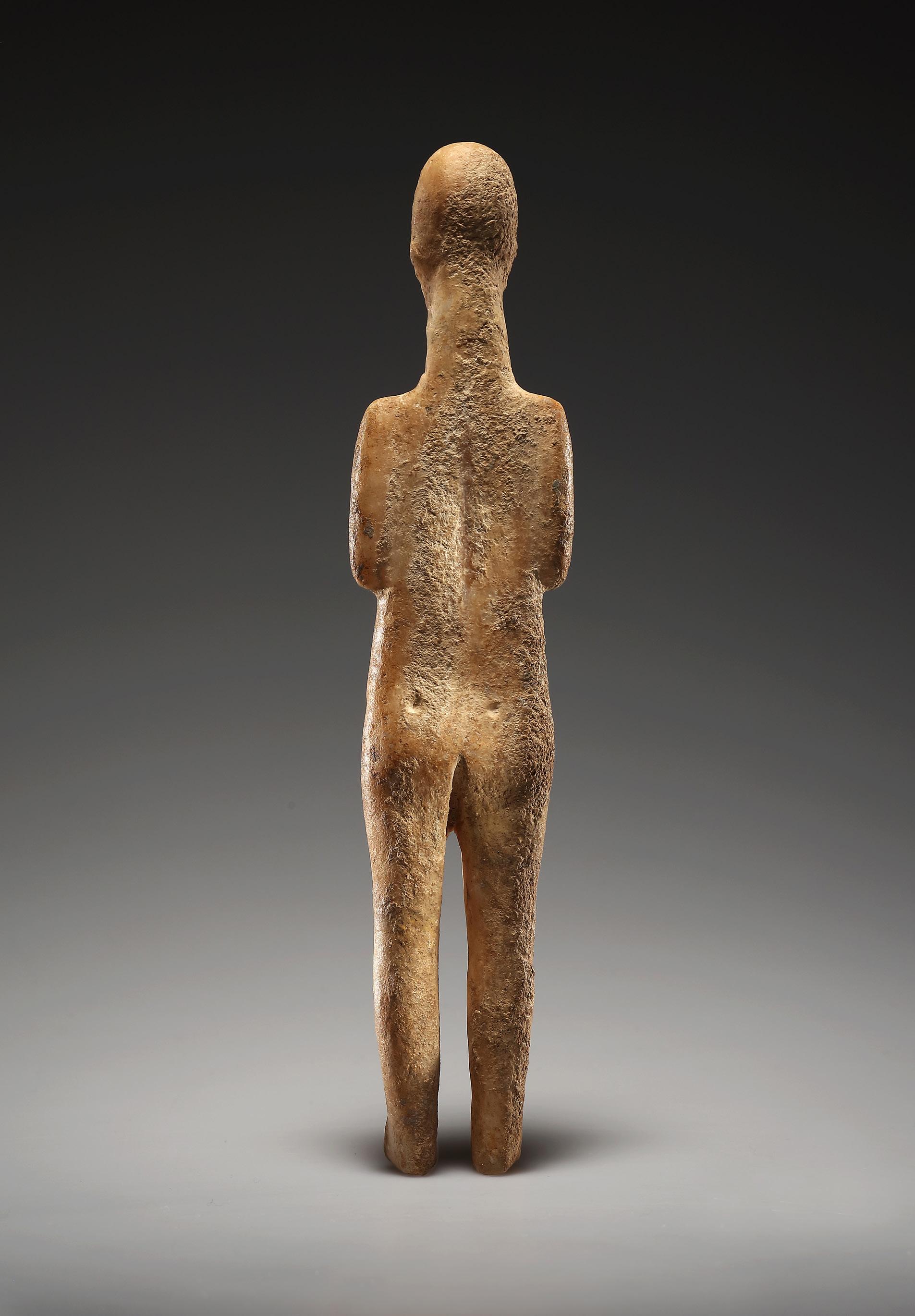 Although starkly upright, the frontality of the female body is belied here by refined anatomical details at the rear. The face is an elongated oval, mouth indicated by a horizontal line, with drilled eyes not quite aligned. Plastically rendered nose and ears (one covered by encrustations). Remarkably, the skull is sensitively modelled with a continuous line extending from the mandible towards the rear, delineating the occipital bone from the neck, which is comparatively thick and broadening towards the shoulders. The slim shoulders are squared, with arms bent at ninety-degrees at the elbow to rest beneath shallow breasts. The arms are not crossed, but instead hands are separated by a thin vertical line, with fingers summarily indicated. The abdomen is visibly swollen, with