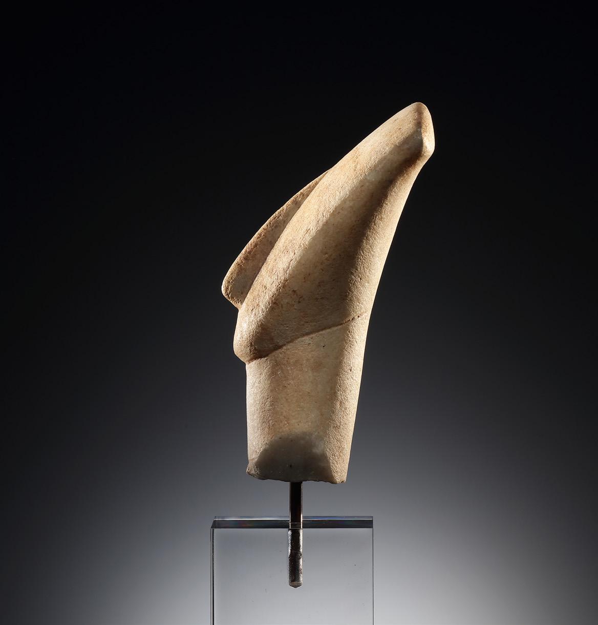 Head of a stylized human figure, which can be assigned to the late so called Spedos type in terms of its shape. Lyre-shaped in its basic form. Prominent nose reaching far into the lower half of the face. Chin with a rounded contour, tapering slightly towards the middle and, viewed from a side perspective, barely protruding beyond the neck. Below the chin there is a flat narrow groove that goes up to the neck and dissolves towards the middle. The upper part of the body, also set off against the neck by a flat, narrow groove, makes it clear that the shoulders sloped steeply. The formal observations mentioned here are stylistic features of the so-called Goulandris master (see also note). Bump on the upper right corner of the head. Fine brownish deposits.