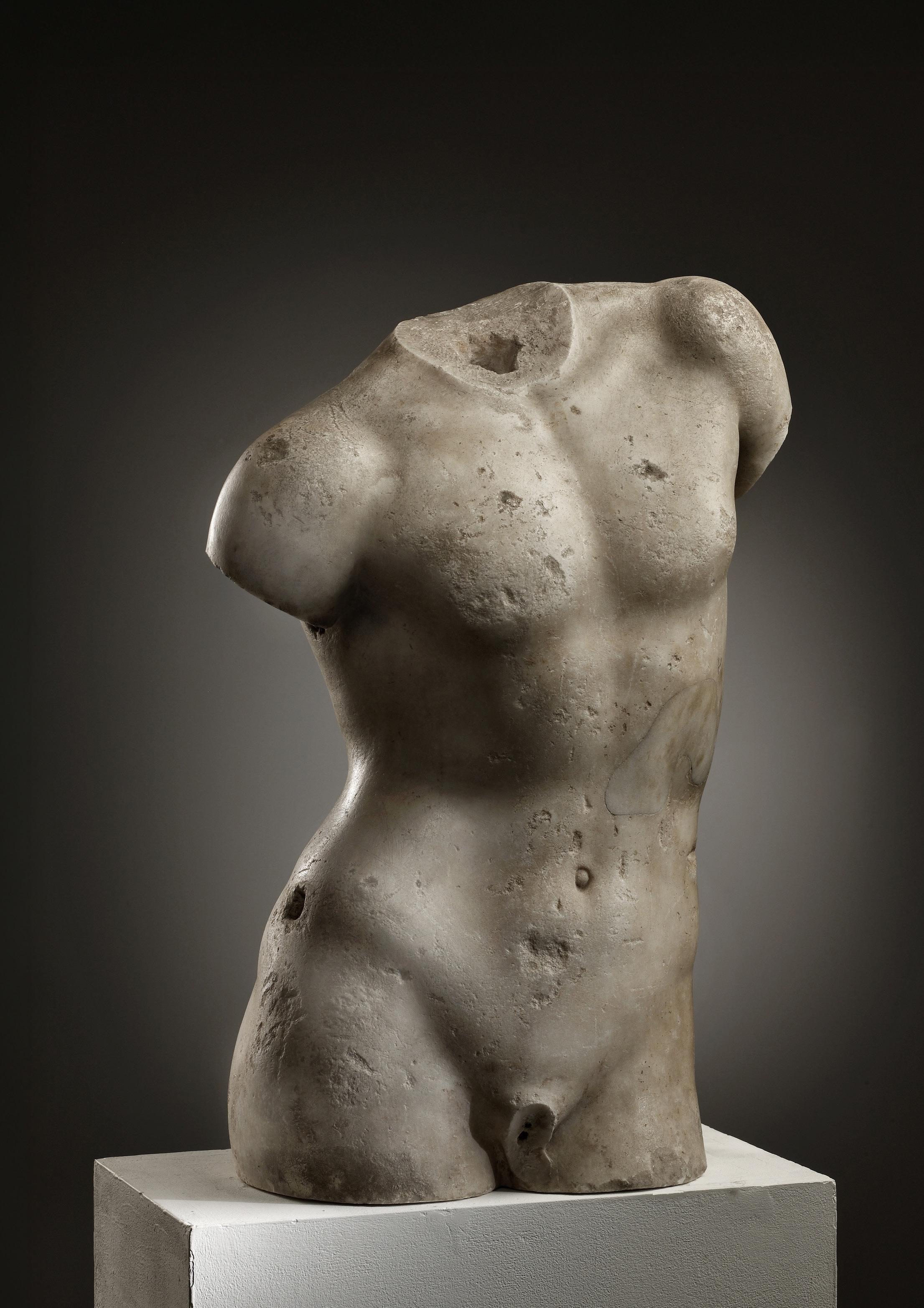 Soft, flowing transitions between the individual sections of the musculature characterise this life size torso, which, due to the absence of pubic hair, appears to be that of a boy or youth. The boyishness and the posture of our torso can be found in a statue group depicting a standing Ganymede with eagle (resp. Zeus in the guise of an eagle). This type is based on a Greek original and has come down to us in several Roman marble copies. On the left side of the back (presumably Latin) letters are recognisable. They are probably the remains of a – possibly ancient – inscription or graffito. Historical restorations to the left shoulder blade. A few superficial fillings, two larger fillings at the belly and the left shoulder blade.