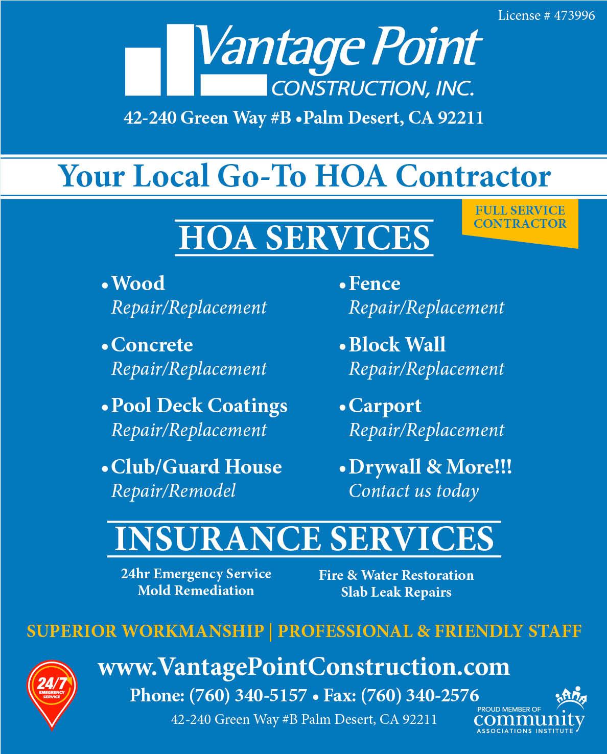 The Coachella Valley HOA Living Magazine is a publication expressly prepared for association leaders, managers and related business professionals of the Community Associations Institute. Members are encouraged to submit articles for publishing consideration. All articles accepted for publication in HOA Living are subject to editing and rewriting by the HOA Living Committee.