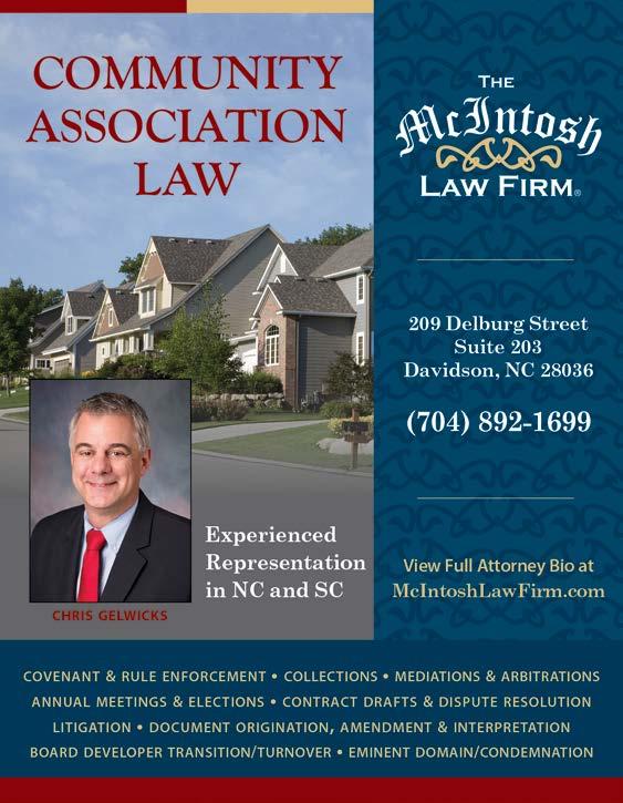 Government Taking Your Property? Put Justice On Your Side. 100 North Tryon Street • Suite B220-397 • Charlotte, NC 28202 Reserve Studies Transition Studies Construction Administration Engineering Evaluations www.gfengineers.com 919-465-3801 Raleigh Office 704-810-1808 Charlotte Office What the 2022 Election Means for Community Associations
