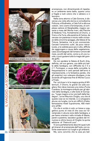 arrampicare, non dimenticando di rispettare un ambiente tanto bello, quanto unico e fragile e tutti coloro che vi abitano e vi lavorano. Nella zona attorno a Cala Gonone, è doverosa una visita alla storica e comodissima Poltrona, al Budinetto, a Cala Fuili e alla sua codula1, vero cosmo d’arrampicata, al complesso settore di Margheddie, magico versante a mare del Monte Irveri, alle Placche di Redenta Tiria, frontalmente al Chorro, a S’arcu e Sa Turre, alle paretine di Cartoe, da cercare con pazienza e intuito nelle vicinanze della omonima spiaggia, alla falesia di Sa Tintura, fantastica, ma ai più sconosciuta. Cercate l’omonimo cuile2, da poco ristrutturato, e la vedrete poco più in alto, difficile da raggiungere a causa della vegetazione. Lassù accompagnati dal lontano rumore del mare, avvolti dal vento, come su di una nuvola, si può gustare tutta la magia del grande golfo. Da non perdere la falesia di Buchi Arta, definita, nel suo genere, una delle più belle della Sardegna, con difficoltà tra il 5 e il 7. Purtroppo, a causa della comodità, la frequentazione in certi periodi dell’anno è impressionante, e la fantastica parete, che gli scopritori non volevano divulgare, si sta avviando all’ingloriosa fine di Monte Cucco a Finale. Per i più bravi vi è la magica grotta di Millennium, il Chorro, le grandi vie sulla scogliera. Non deve mancare una visita a Punta Cusidore, la montagna simbolo per gli alpinisti della Sardegna, e alle Gole di Gorroppu, "luogo magico e tra i più belli della Sardegna", scrive Maurizio Oviglia, uno che di queste cose se ne intende. Lì si sviluppano alcune vie lunghe, tra le più difficili d’Italia: famosissima Hotel Supramonte, 400 metri sino all’8b! Ciò che è scritto è solo un breve e soggettivo punto di vista di che cosa sia l’arrampicata in alcune zone della Sardegna, e per bene orientarvi nella miriade di falesie, pareti e paretine, lasciatevi guidare dal minuzioso e ultimo lavoro di Oviglia: la quinta edizione di “Pietra di Luna”. Vi sono perfettamente descritti quasi tutti gli itinerari di arrampicata dell’Isola, con colorite osservazioni sui luoghi e gli ambienti. Ma, sono convinto che la cosa più bel-